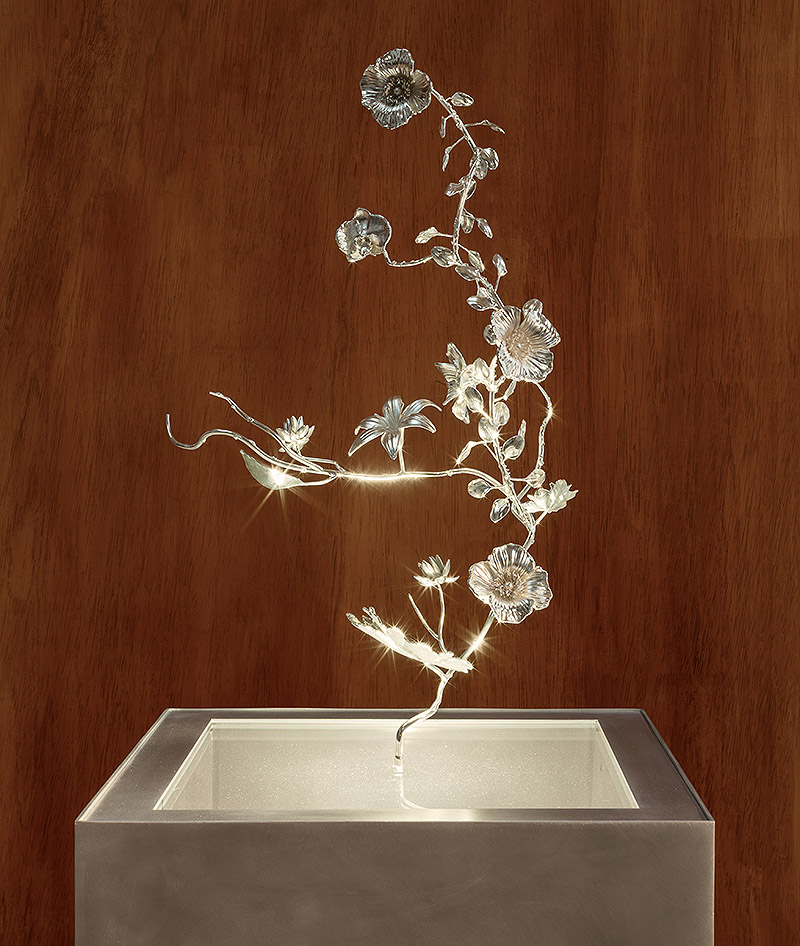 La pieza central de la exposición La Cristalización de un Paseo es una rama plateada meticulosamente elaborada (40x40x150 cm). Esta escultura, concebida digitalmente, pero ejecutada de manera tradicional, tiende un puente entre lo virtual y la artesanía física, su tratamiento galvánico con níquel y plata fina (999 milésimas) captura y refleja la luz de manera que hace eco de los temas más amplios de la exposición sobre la transmisión y la transformación.