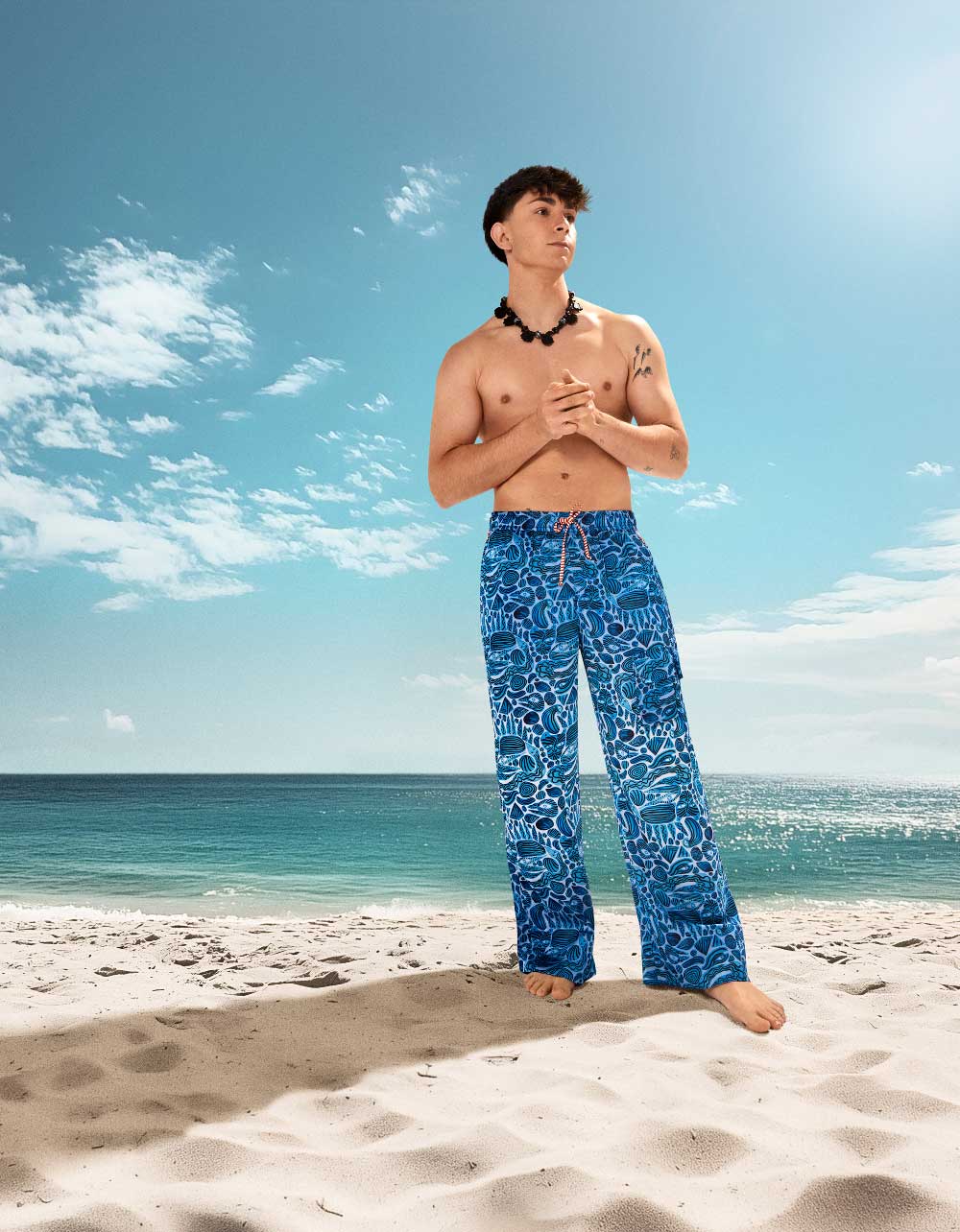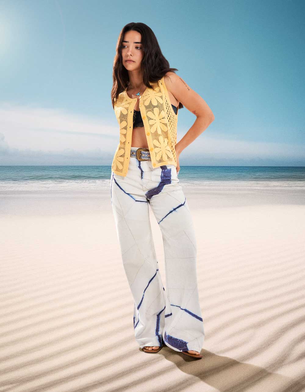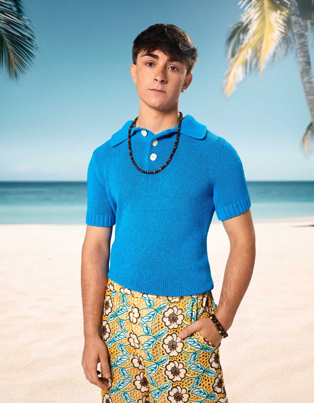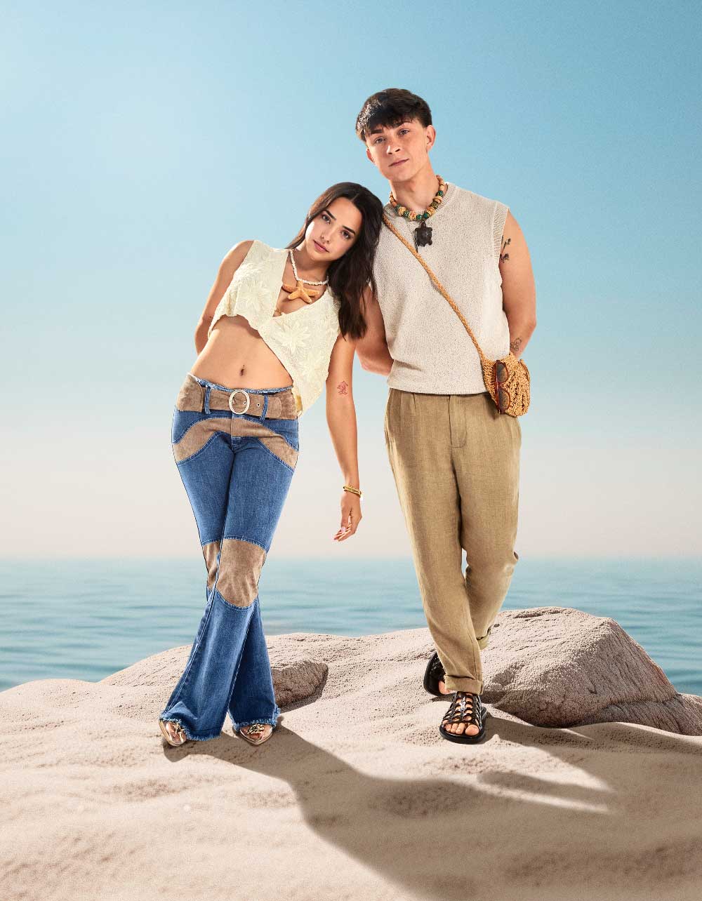 Àngela: top de cuero LONGCHAMP + malla de print floral BIBENCIA + pendientes THOMAS SABO / Archie: camisa crochet ANTIK BATIK + camiseta MARC O’POLO + ba.ador SCOTTA 1985 + fragancia unisex L’EAU PURE de KENZO