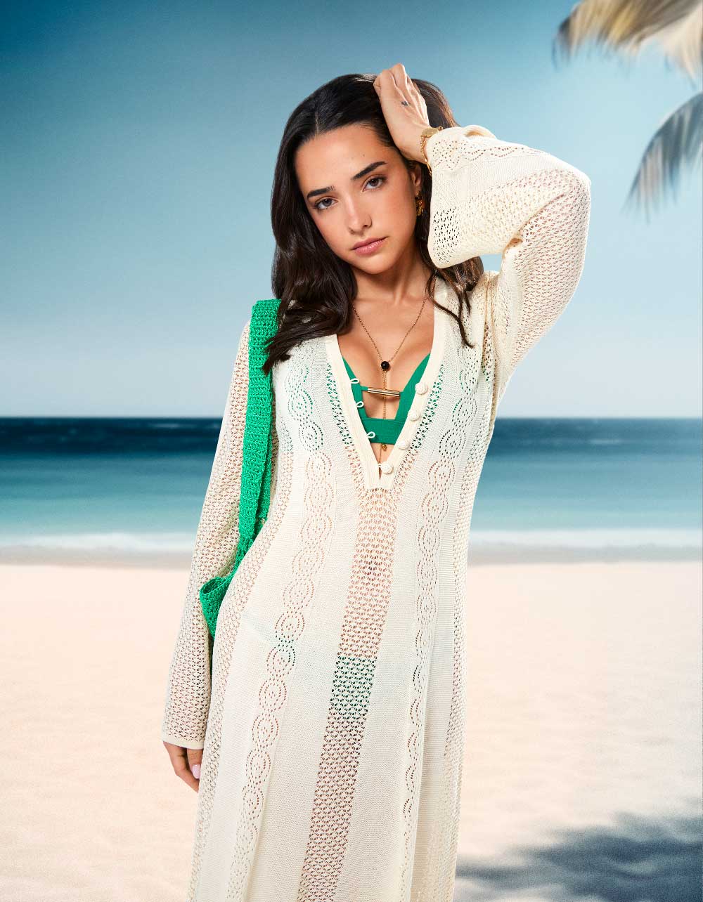 Bikini HUNKEMÖLLER + vestido de punto TWINSET + bolsa LA NOUVELLE + pendientes LUXENTER + collar UNOde50 + pulsera ALMADIVERSA + anillo SINGULARU
