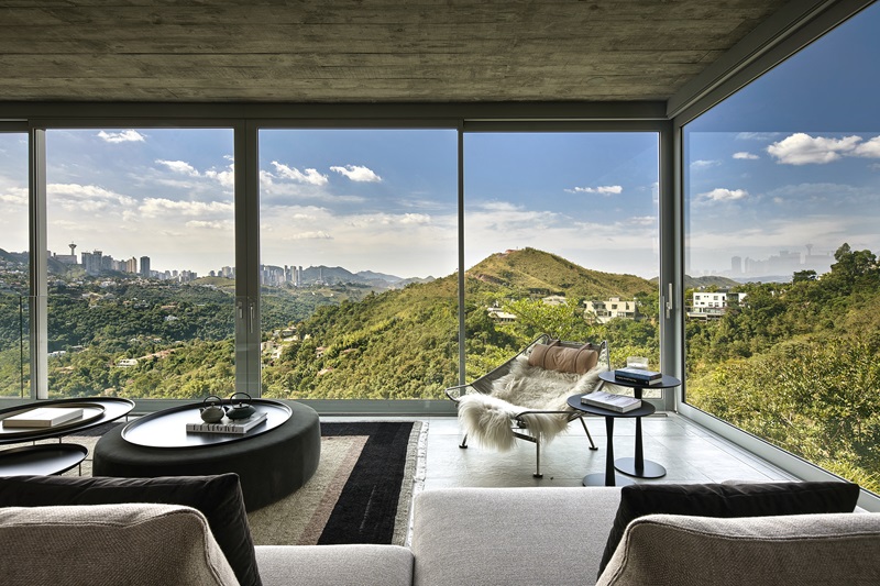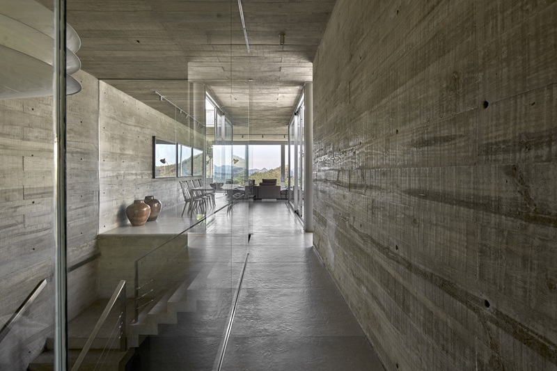 Las vistas panorámicas son el primero de los grandes lujos de esta casa de hormigón, desde la que se pueden contemplar las verdes montañas de la sierra a través de los planos de vidrio colocados a lo largo de casi todo el perímetro de la fachada. Otro de sus atributos extraordinarios es su amplia superficie de 711 m², distribuidos en dos niveles.