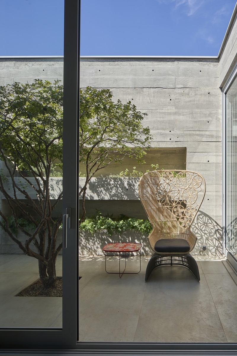 Aunque la entrada principal se encuentra en la planta baja, las principales estancias que integran el núcleo de la vivienda están en el nivel superior. En un ala de la casa, los arquitectos han organizado la zona de día, que consiste en una sala de estar, un comedor y una cocina en torno a un patio central abierto al exterior. Un espacio íntimo y agradable, engalanado con un pequeño árbol, que aporta todavía más luz a los interiores y posibilita la ventilación cruzada. Su diseño se complementa con dos hileras de jardineras corridas para que los residentes puedan plantar las especias utilizadas en la cocina.
