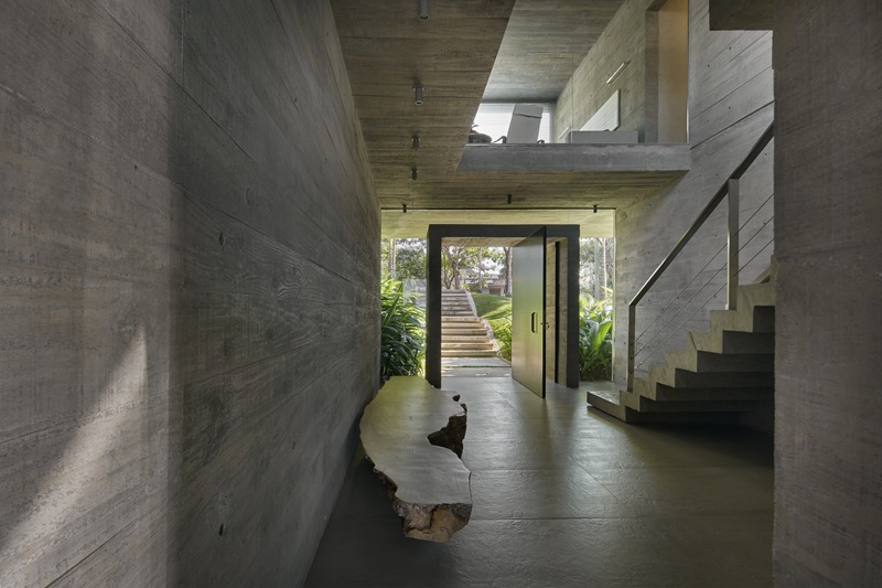 La fachada frontal está presidida por un bello jardín de palmeras, que da acceso al garaje y a la vivienda. El recorrido se inicia en la escalinata que desciende desde el nivel de la calle atravesando el jardín. Y culmina en la gran puerta pivotante de la entrada, que es uno de los elementos más monumentales de este proyecto. Rodeada por un imponente marco de hormigón y un frente de vidrio que deja pasar la luz hacia el interior.