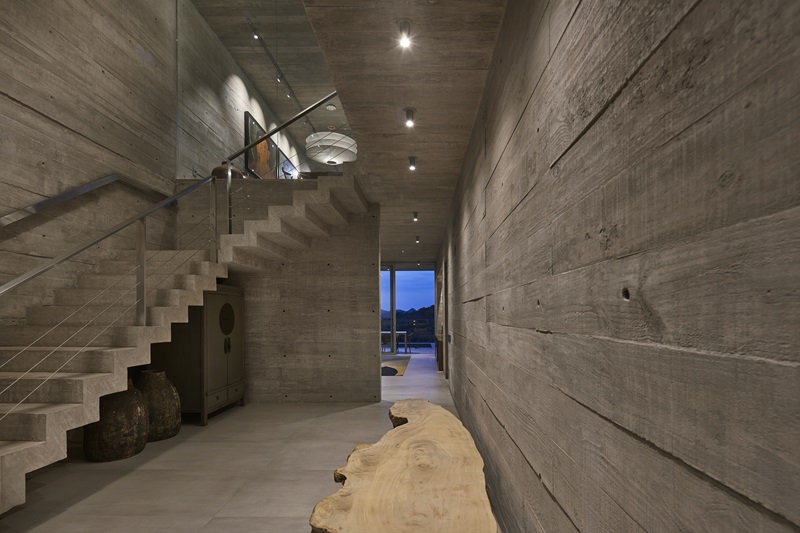 El hormigón visto aporta una bella textura a las paredes interiores, cualidad que lo convierte en el principal elemento decorativo de la vivienda. Como detalle constructivo, merece una mención especial los agujeros propios de los muros de hormigón in situ, que se preservan en la mayoría de los paramentos verticales.