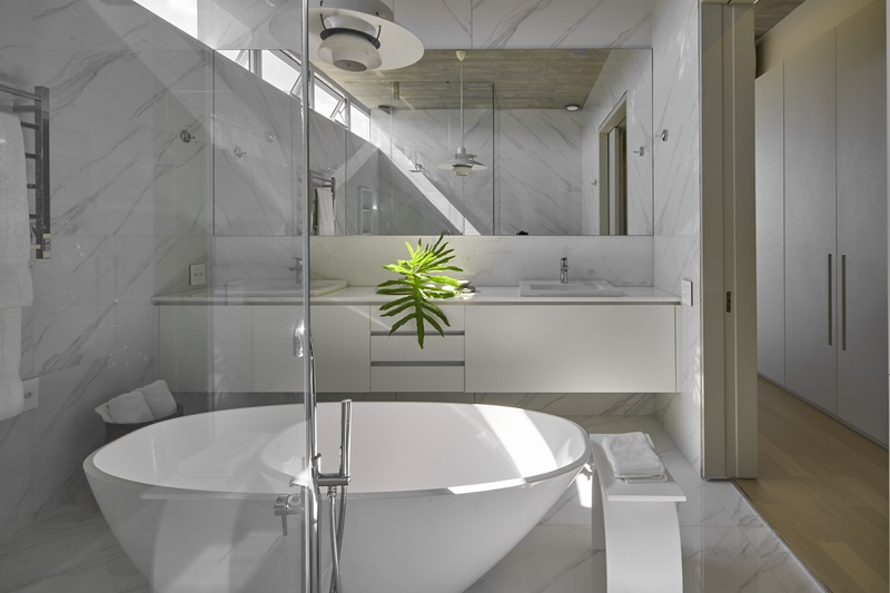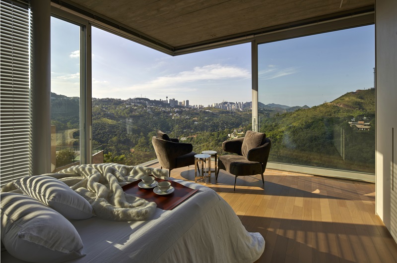 La suite principal se abre por completo al hermoso paisaje. Posee un cerramiento de vidrio de suelo a techo, con puertas correderas y una barandilla de cristal, prácticamente invisible, que permite a los residentes asomarse igual que a un balcón. Los arquitectos han escogido un acabado de madera para los suelos con la intención de generar un ambiente más acogedor en los dormitorios. Por el contrario, en los baños recurren a la pureza del blanco para crear una atmósfera de aspecto impoluto, sobrio y elegante.