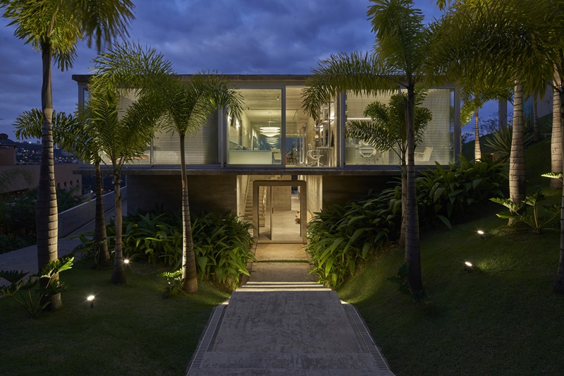 En la ciudad de Nova Lima del estado brasileño de Minas Gerais, famoso por su industria minera y descubrimientos de oro, se encuentra este volumen de 711 m² construido por el equipo de Ângela Roldão Arquitetura, que tiene de fondo la frondosa naturaleza de la Serra do Curral.