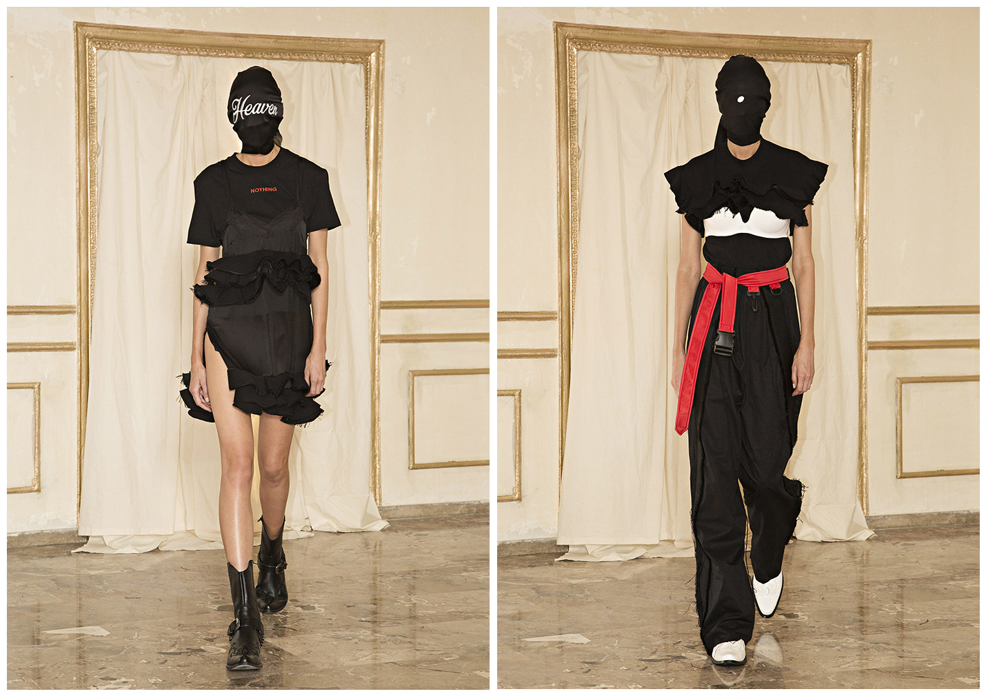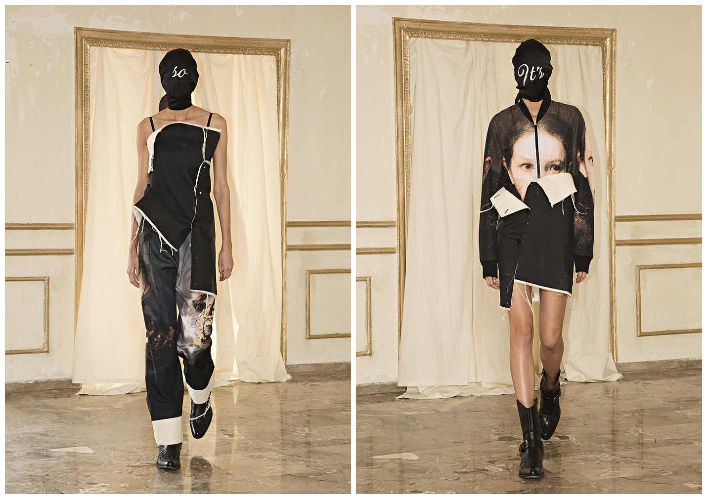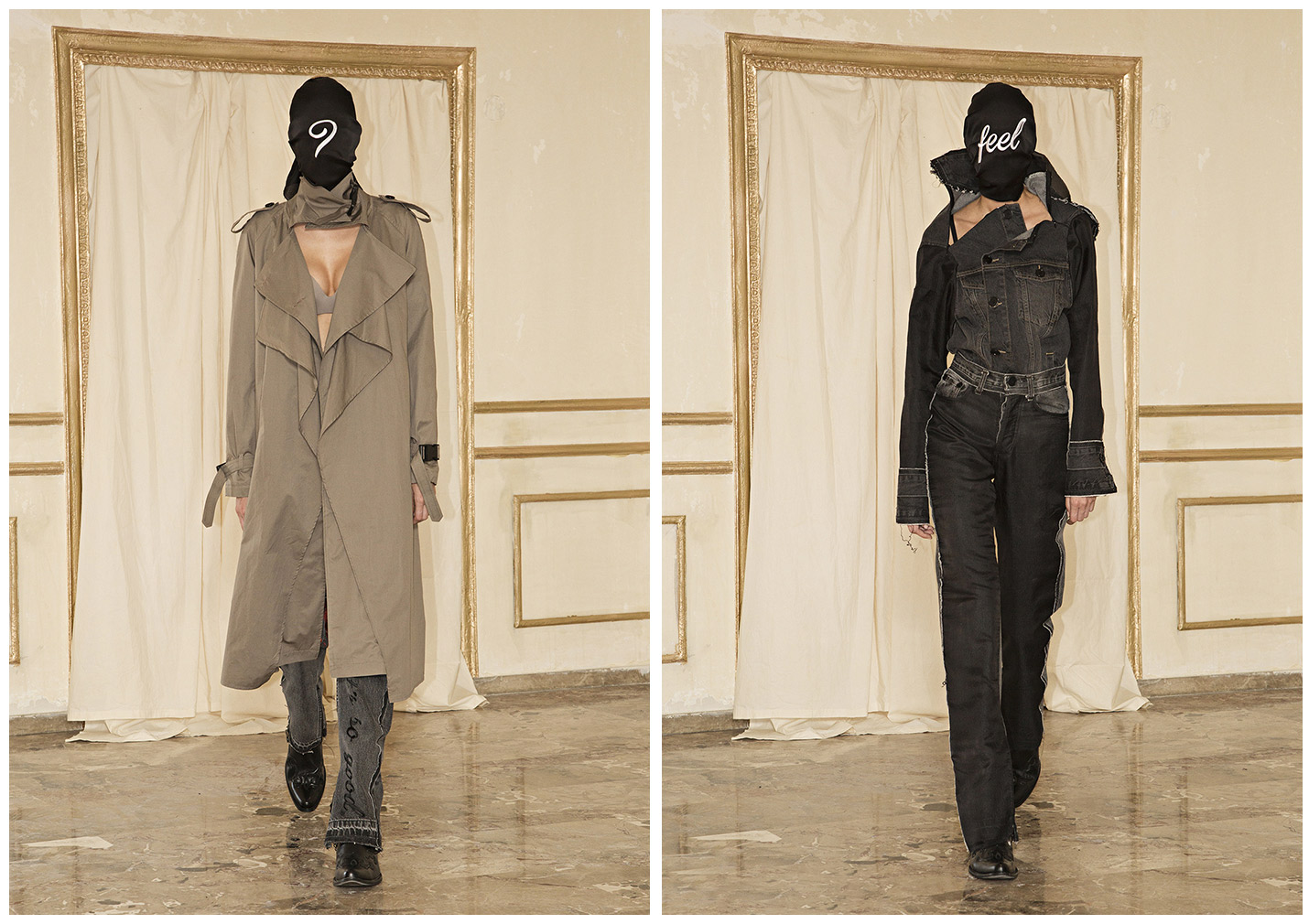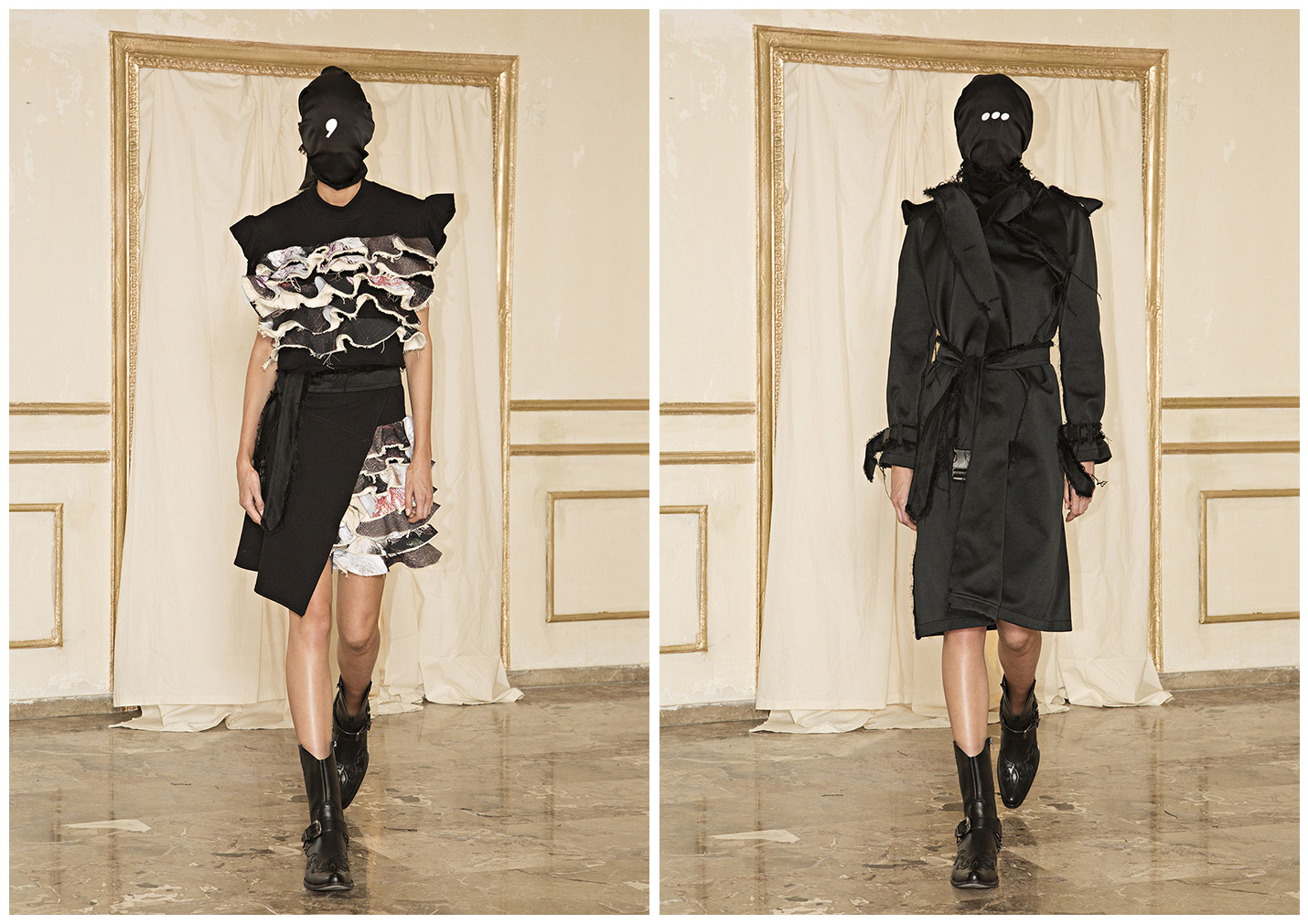 Bajo la influencia de Rembrandt y los pintures de la escuela flamenca del siglo 17, el diseñador griego Angelos Frentzos presenta una colección donde se mezcla el streetwear con la sastrería. Un juego de contradicciones que observamos también en los diseños y siluetas, donde se pasa del oversize al slim fit o de las super estructuras a la desestructuración total. Una propuesta con una estética romántica, gótica y erótica, reforzada por la gráfica en algunas prendas que transcriben la letra de uno de los himnos de la música disco, el I Feel Good de Donna Summer. Y como siempre, desde hace muchas temporadas, dando su personal toque de dramatismo al ocultar las caras de las modelos con tejidos al mejor estilo Magritte. Moda, Arte & Música.