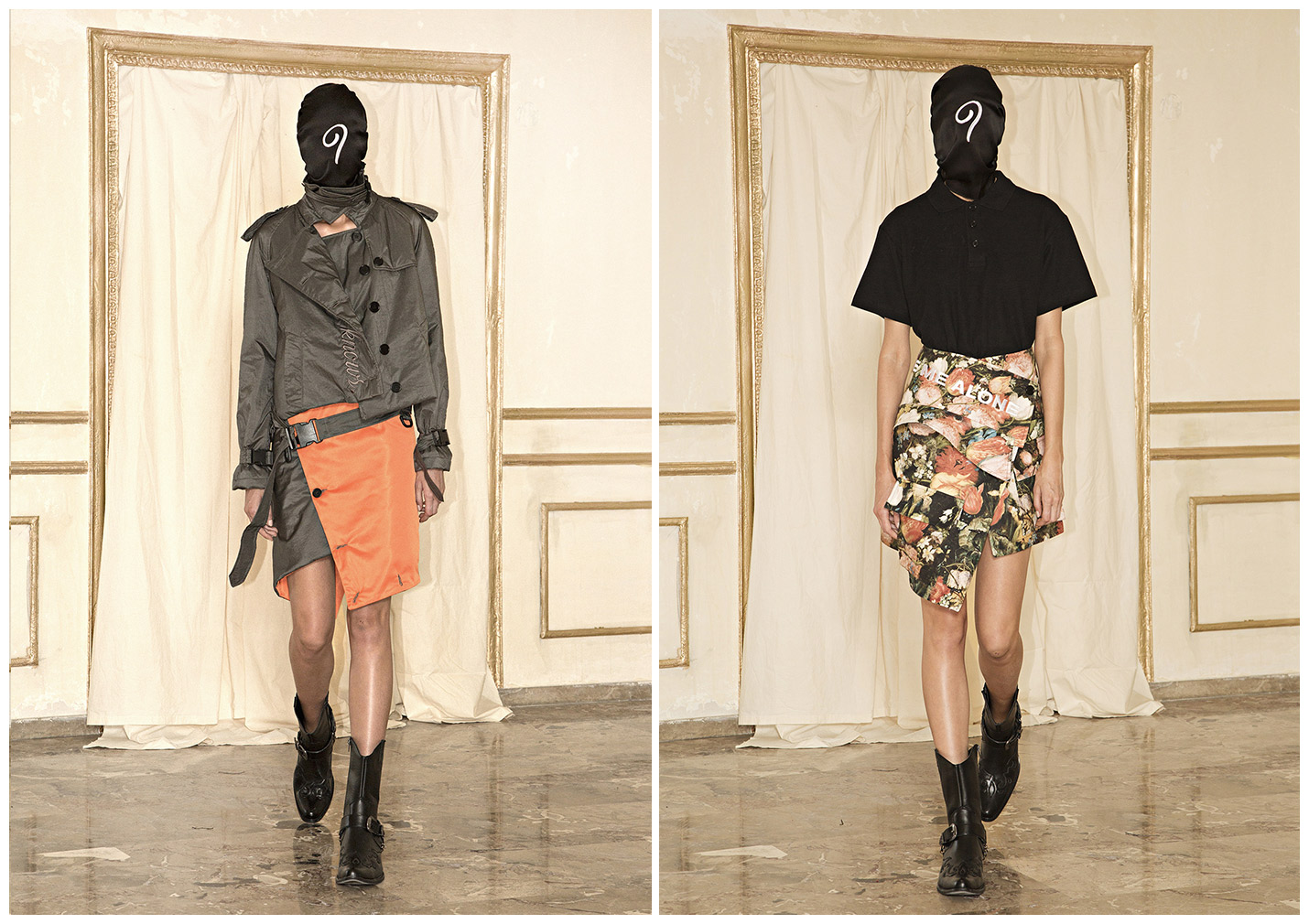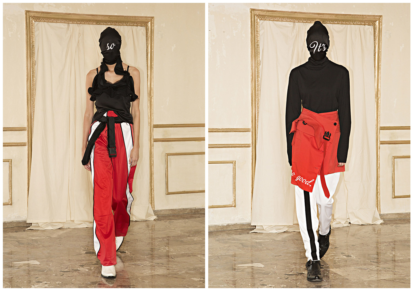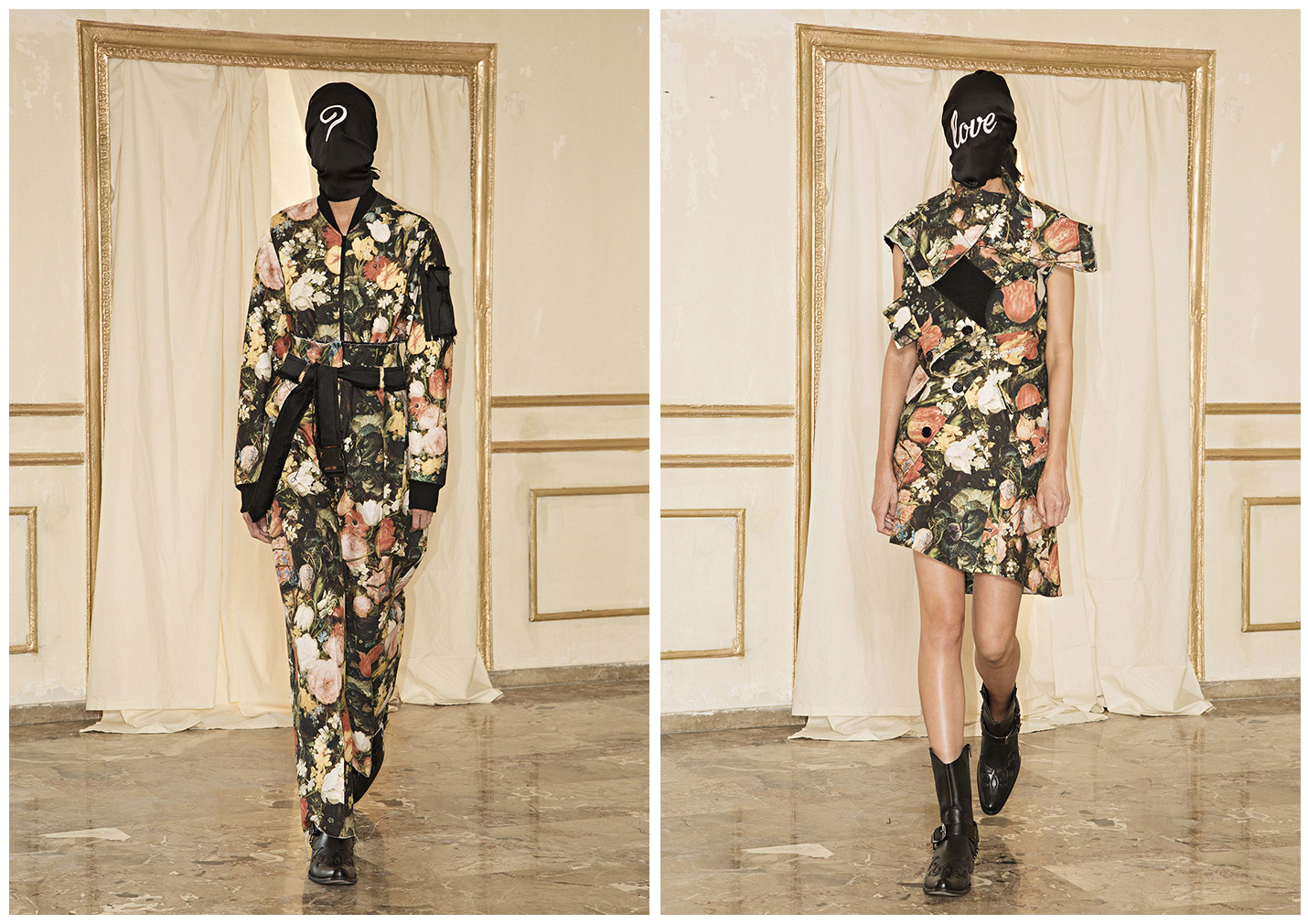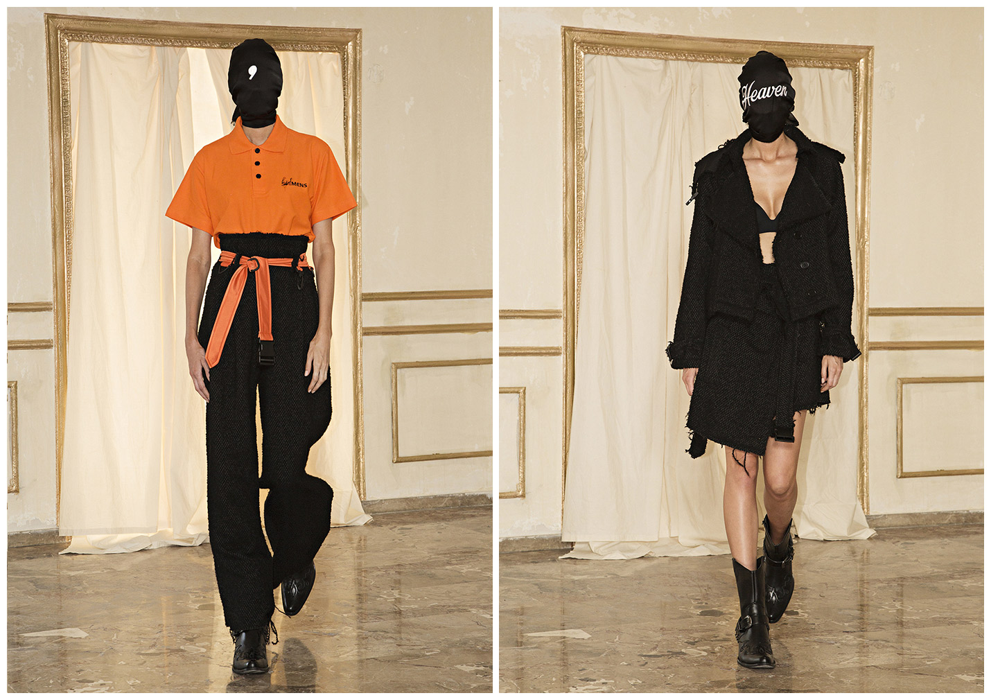 Bajo la influencia de Rembrandt y los pintures de la escuela flamenca del siglo 17, el diseñador griego Angelos Frentzos presenta una colección donde se mezcla el streetwear con la sastrería. Un juego de contradicciones que observamos también en los diseños y siluetas, donde se pasa del oversize al slim fit o de las super estructuras a la desestructuración total. Una propuesta con una estética romántica, gótica y erótica, reforzada por la gráfica en algunas prendas que transcriben la letra de uno de los himnos de la música disco, el I Feel Good de Donna Summer. Y como siempre, desde hace muchas temporadas, dando su personal toque de dramatismo al ocultar las caras de las modelos con tejidos al mejor estilo Magritte. Moda, Arte & Música.