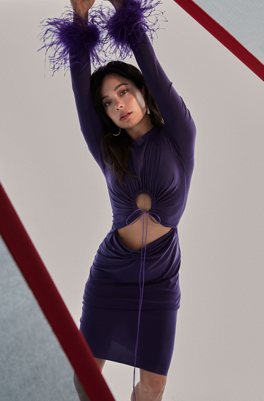 Su Majestad con vestido y guantes VERSACE + 74 75 Gafas PHILIPPE MODEL + Reloj AUDEMARS PIGUET Modelo Code 11.59 con caja de 38 mm en oro rosa de 18 quilates, esfera violeta y correa de piel de aligátor