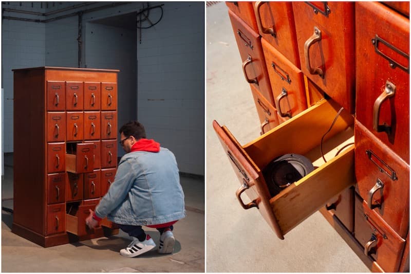 A continuación y ocupando toda la sala, The Infinity Machine (2015) nos invita a reflexionar sobre el espacio y el tiempo, con sonidos de las sondas Voyager de la NASA y espejos que crean un paisaje infinito. En la gran sala adyacente se ha instalado The Forty Part Motet (2001). La pieza nos rodea literal y emocionalmente con una composición coral compuesta por 40 altavoces. El sonido cambia dependiendo de la posición, creando una experiencia sonora íntima y única. Tras deambular entre las voces del Motet el recorrido nos lleva ante The Cabinet of Curiousness (2010). Aquí, nos invitan a abrir cajones de madera que liberan sonidos combinados de manera impredecible, evocando memorias personales y colectivas. Antes de subir a la planta de arriba, pasamos por la 2ª obra cinética de Bures Miller: Imbalance.6 (Jump) de 1998. Esta vez se muestran los pies del artista saltando en un monitor, creando, de nuevo, una sensación de agitación e inestabilidad.