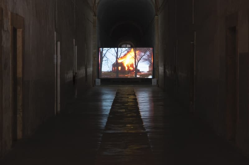 Al entrar al Monasterio de Santa Clara-a-Nova, nos encontramos con una cortina de seda negra proyectando sombras de fuego. Según los artistas, pieza clave para comenzar la inmersión, ya que está pensada como una reflexión sobre la memoria colectiva y el miedo al fuego, creando así una atmósfera de incertidumbre, de expectación. Sigue al fondo del pasillo House Burning (2001), un filme que nos sumerge en el sonido de un incendio y de sirenas, mientras una cámara muestra bomberos en acción. La obra desdibuja la línea entre realidad y ficción, explorando la vulnerabilidad humana frente a desastres. A continuación, una de las dos piezas cinéticas de George que hay en la muestra: Imbalance.1 (Wings) de 1994. Una escultura cinética de sus inicios donde que evocando la sensación de desorientación e inestabilidad, mientras explora la tensión entre la quietud y la expresión de las manos agitándose.