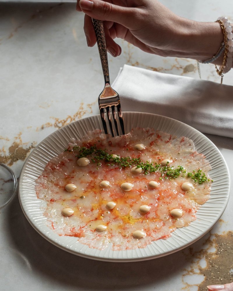 Imágenes superiores: 1) Carpaccio de gamba roja de Palamós con emulsión de aceite cítrico y mayonesa de algas. 2) El brioche, el bogavante y el caviar forman una combinación única.