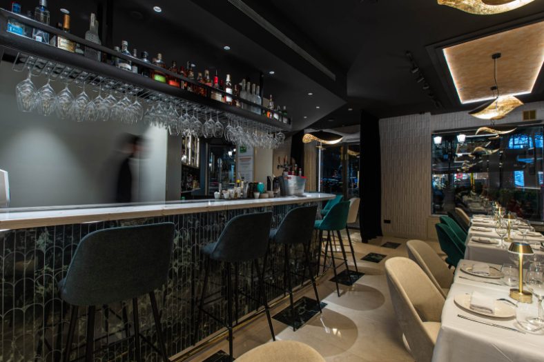Imágenes superiores: 1) En la entrada del local se encuentra un espacio con los mejores destilados. 2) El diseño del restaurante mezcla el clasicismo parisino con la frescura mediterránea.