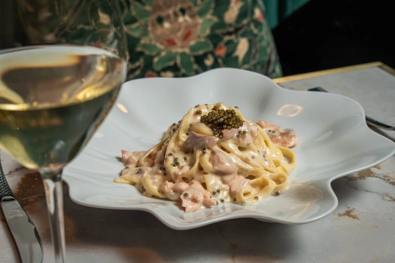 Imágenes superiores: 1) El canelón de asado con reducción de Pedro Ximénez. 2) Fettuccine a la Zarina con nata, salmón, vodka y caviar.