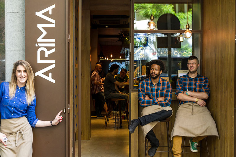 Imagen superior: Nagore Irazuegui y su equipo en la puerta de Arima Basque Gastronomy