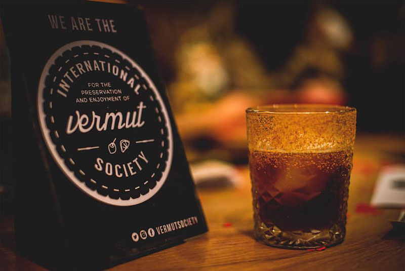 Imagen superior: detalle de vermú y del cartel International Vermut Society en Arima Basque Gastronomy