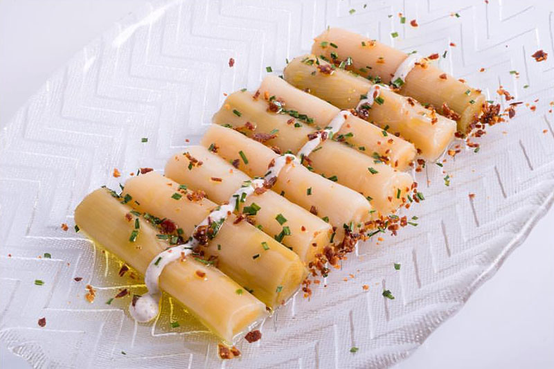 Imagen superior: plato de puerros confitados con crujiente de ibérico