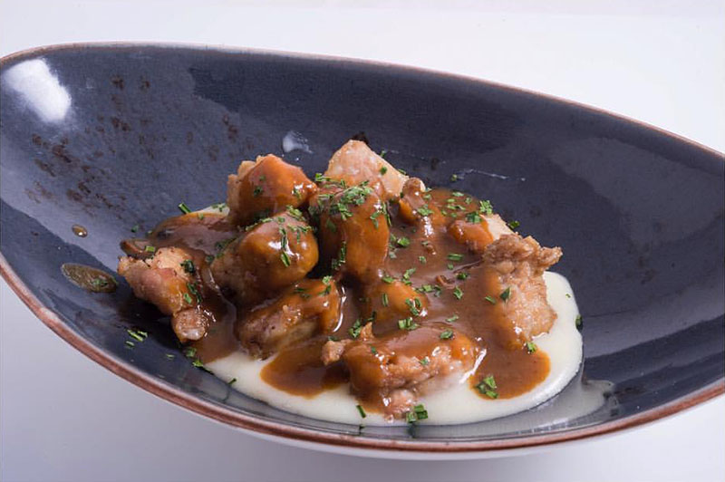 Imagen superior: plato de mollejas de ternera con patatas al mortero