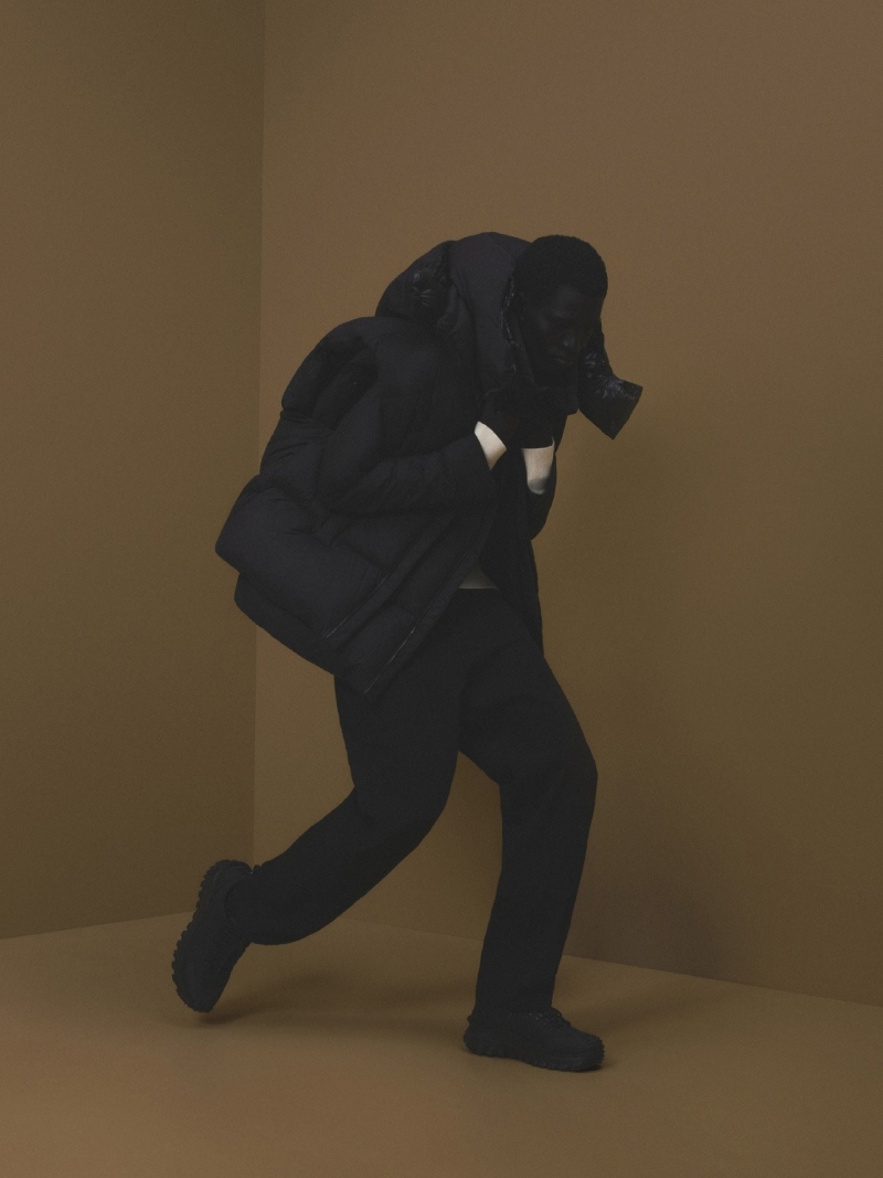 La otra estrella grande de Moncler X Roc Nation es un gilet acolchado. De igual manera, esta prenda se presenta en su versión más voluminosa con una construcción arquitectónica que sirve como declaración en sí misma. De igual manera, un parche de goma tono sobre tono en el pecho se encarga de coronar el chaleco. Terminando el outerwear, tenemos un puffer más tradicional para los fríos más extremos con el mismo corte oversize y exagerado.