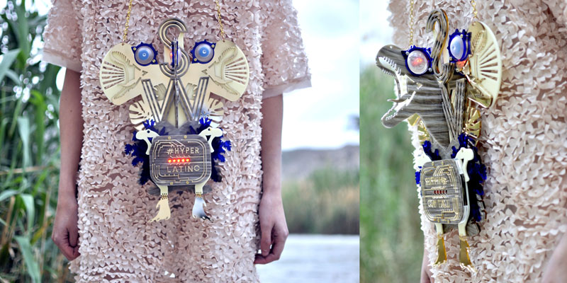 En 2015, el rapero de San Francisco Swanisimo Hyperlatino nos pidió para una de sus performances que le diseñáramos un collar inspirado en un Tiranosaurio Rex, su animal fetiche. El proyecto lo desarrollé como Fru*Fru y fue la primera de las joyas que diseñé. Ese proyecto ha derivado ahora en Garra Studio.