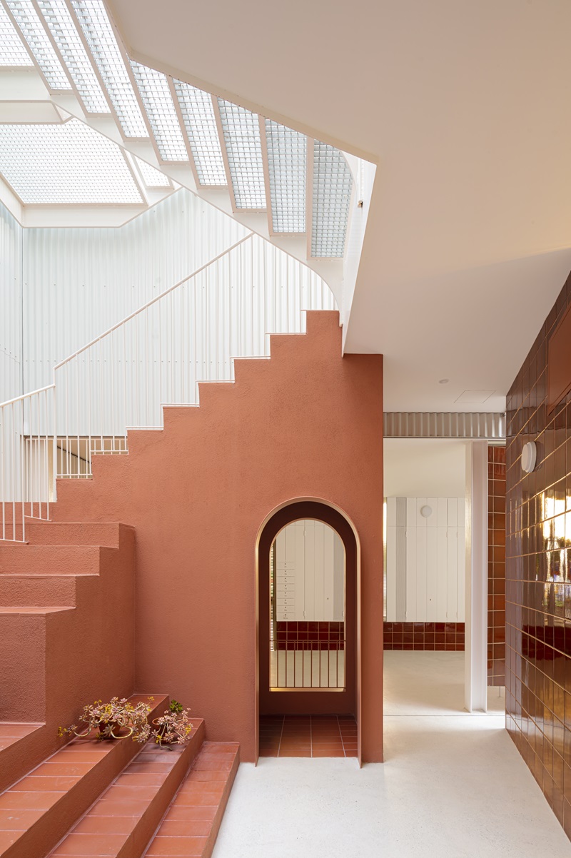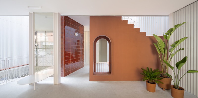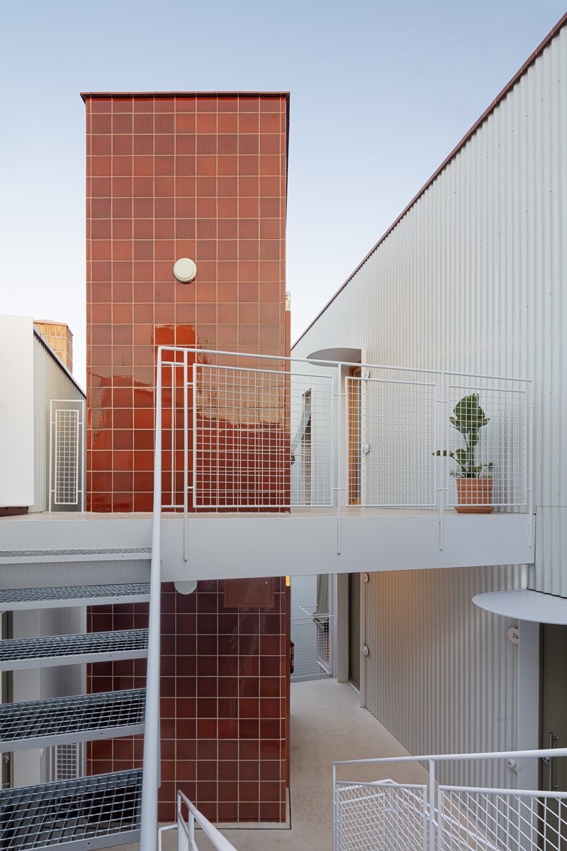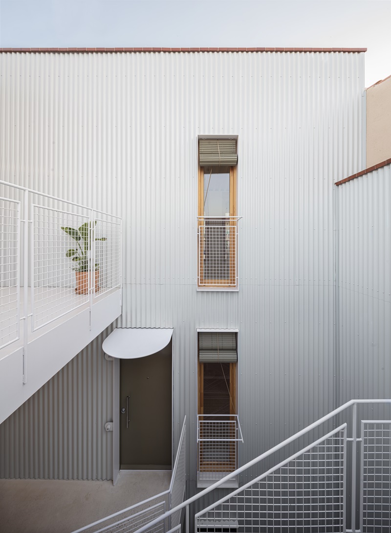 Concebido como un núcleo de comunicación vertical al aire libre, el patio central se convierte en el corazón del proyecto, dando acceso a las siete viviendas de este bloque de cuatro plantas. Su divertida estética combina el lenguaje tradicional de la cerámica con el estilo industrial de la estructura y los paramentos metálicos. Ligeramente distanciado de la fachada principal, divide transversalmente el volumen en dos, multiplicando las posibilidades de diseño de las viviendas. El objetivo de Be Studio era “ofrecer opciones adaptadas a distintas necesidades y estilos de vida para que el proyecto sea inclusivo y pueda satisfacer a una amplia gama de usuarios. La diversidad de las viviendas enriquece la comunidad y fomenta la interacción entre diferentes grupos de residentes, desde parejas jóvenes hasta familias más grandes y personas mayores”, afirma Baulies. Algunas de las viviendas, además, cuentan con patio interior privado. Su posición al fondo del solar permite iluminar los interiores de las plantas más longitudinales en los distintos niveles.