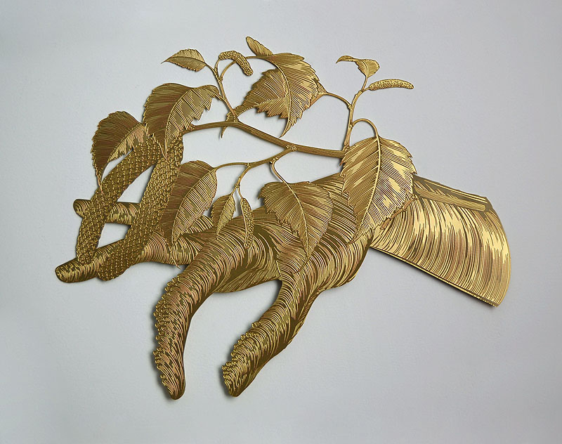 Imagen superior: Marina Nuñez. “Envidia (rama de abedul)”, 2022, bajorrelieve en latón lacado.
