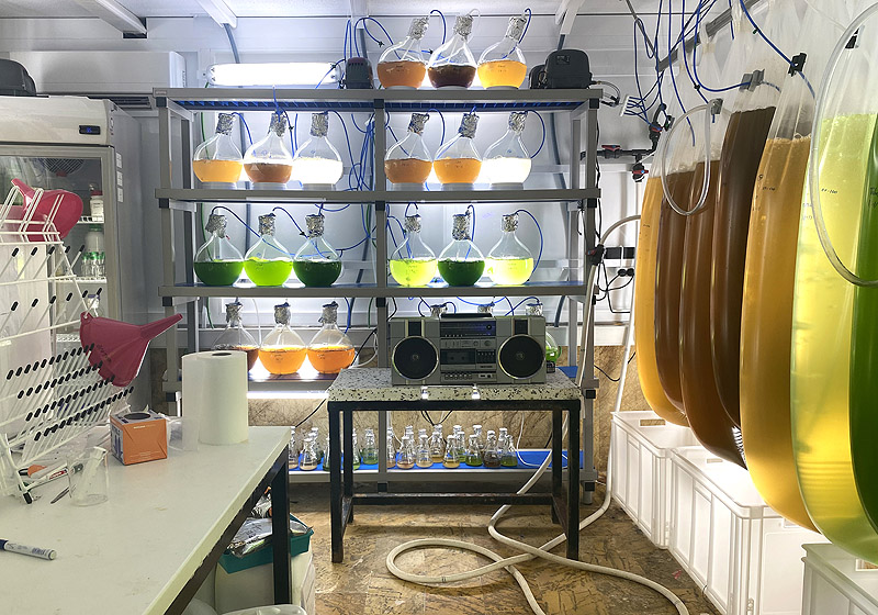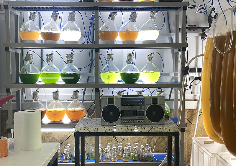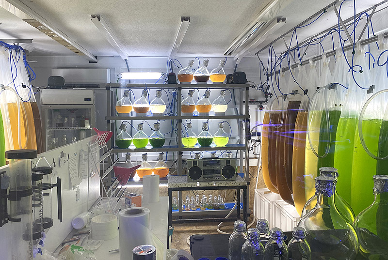 En algunas ocasiones observamos acciones que muestran escenarios posthumanistas en los que la vida se reproduce fuera de su hábitat natural. Reflejan un panorama desolador recogido en numerosas obras artísticas. Hablamos aquí de un laboratorio donde la vida del Mar Menor intenta continuar y donde se simulan composiciones químicas para que especies en vías de extinción como el caballito de mar o las nacras del Mar Menor continúen existiendo.
