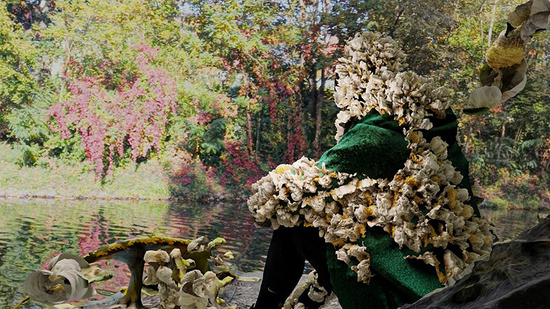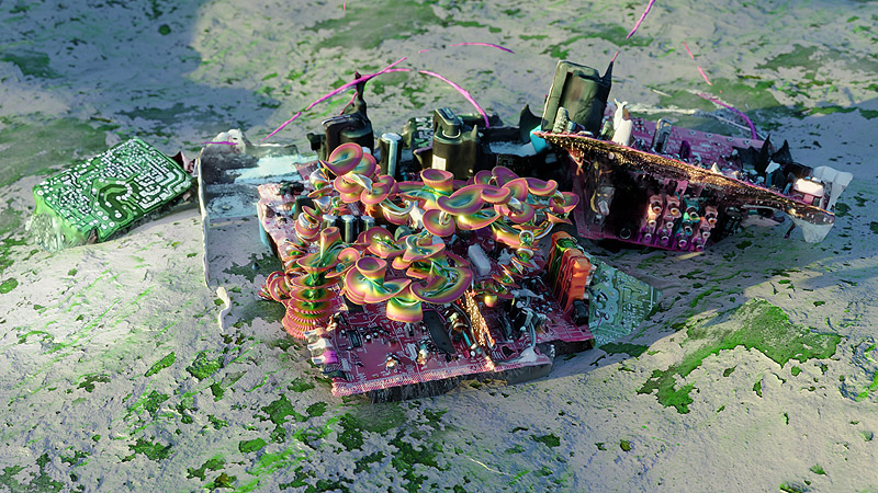 También vemos como “Inflorescences” (2023) de Sabrina Ratté se desarrolla en un futuro hipotético, otro ejemplo de Arte y caos climático, donde plantas, hongos y bichos desconocidos han sufrido mutaciones para existir en simbiosis con objetos abandonados. Éstos retratan un mundo desprovisto de humanos. Por lo tanto su evolución está determinada por los restos que dejaron atrás.