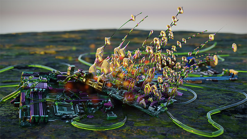 El artista Donatien Aubert plantea la manera en la que la modernidad tecnocientífica ha trastornado la relación que la especie humana mantiene con la vida y los ambientes en los que se inserta. En su obra “Les jardins cybernétiques (Chrysalides)” (2020), Aubert, también ofrece una visión general y sus consecuencias para el desarrollo de las sociedades contemporáneas.