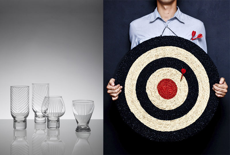 Arriba: izquierda: Colección Reused History, diseño de Tomas Kral en colaboración con la Real Fábrica de Cristales de La Granja. Edita PCM Design. Derecha: Alfombra del proyecto Artesanía & Diseño realizado por Cristina Carpena y José Alburquerque. Está formada por dos círculos concéntricos de esparto de manera que uno de ellos funciona como diana para jugar a los dardos.