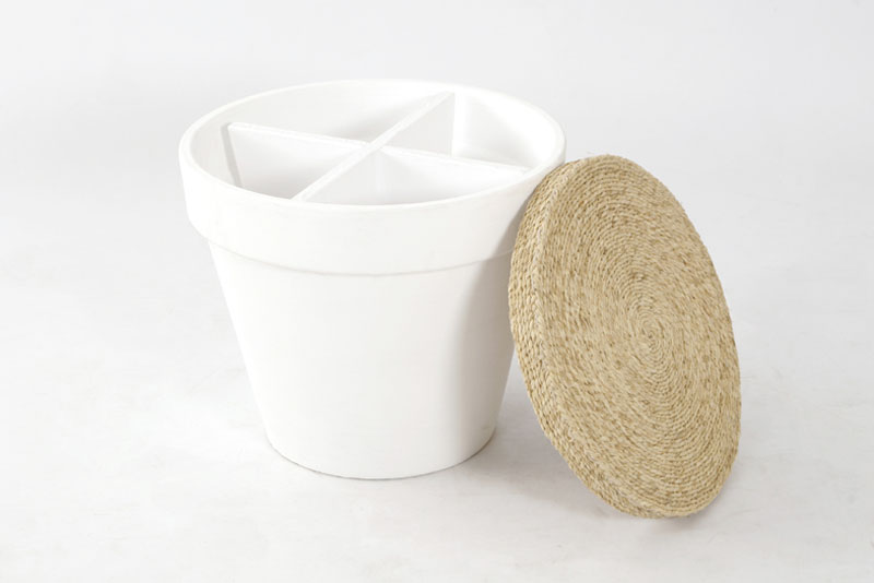 Arriba: Taburete del proyecto Artesanía & Diseño realizado por Cristina Carpena y José Alburquerque. Con cojín de esparto, tiene una base inspirada en los maceteros de barro que funciona también como elemento de almacenaje.