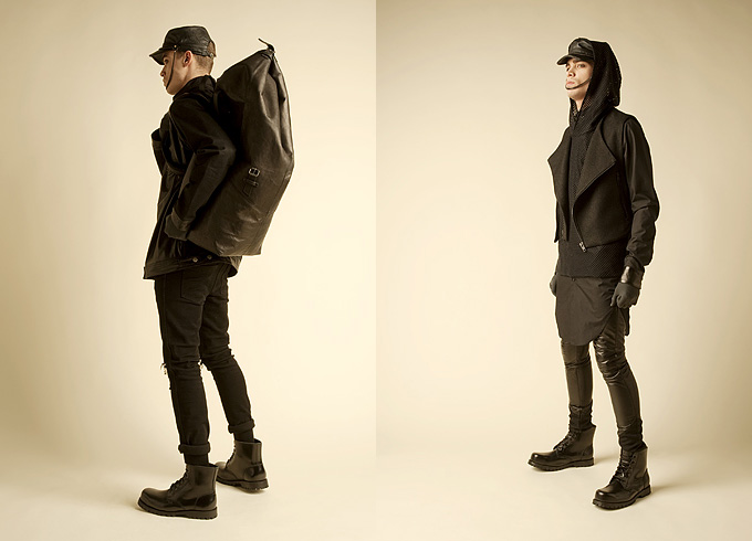 En su colección para este otoño-invierno, Asger Juel Larsen, diseñador danés afincado en Londres, echa mano de los símbolos más icónicos de la historia yanki y los reinterpreta en una colección a medio camino entre el Brando de “Salvaje” y un Dave Gahan el plena exploración de las posibilidades menos minimalistas del negro. Como corresponde a su contexto postapocalíptico, las prendas lucen desgarradas, apagadas e incluso polvorientas, lo que, sumado a la profusión de tachuelas, converge en una estética con un punto trash-punk. Impertérritos soldados con el petate al hombro eluden el contacto visual mientras enarbolan desteñidas banderas americanas y juegan a volar envueltos en andrajosas redes de pesca. El principio del fin se acerca…