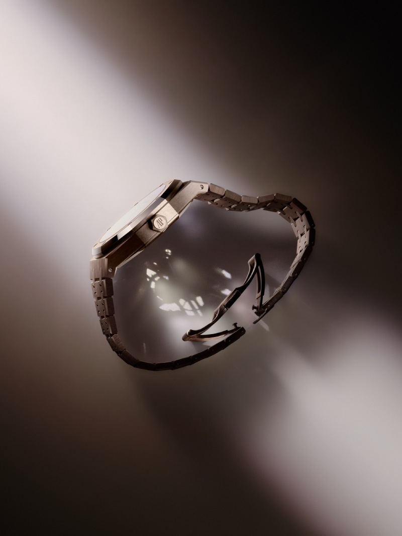 El siglo XXI trajo un declive en la demanda por relojes de oro amarillo y rosa, por lo que estas versiones comenzaron a salir del catálogo (para regresar solo en momentos especiales). Pues ahora, Audemars Piguet mira una vez más al futuro con una nueva aleación de oro, cosa que no es raro en el mundo de la alta relojería. Muchas casas tienen su propio oro, y el de esta manufactura se llama Oro Arena. Esta nueva aleación se hace con de oro de 18 quilates, cobre y paladio para lograr un acabado pálido y muy interesante. Es el punto medio entre el oro blanco y el rosa y, según lo miremos en la luz, cobra distintas tonalidades.