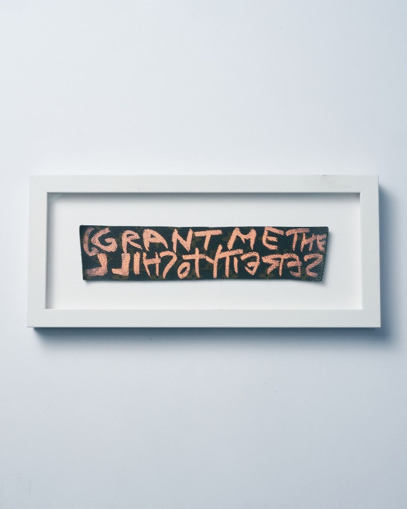 Ahora la colabo de Stephen Sprouse X Marc Jacobs, de entrega póstuma, referencia esta unión. Pero también, da luz sobre la estrecha relación que ambos entablaron cuando crearon la cápsula. En este proceso, Sprouse tomó un trozo de la lona y puso su propia versión de la oración de la serenidad como un regalo para Jacobs. En un reciente post en sus redes, Marc cuenta cómo sigue volviendo a esta pieza cuando las cosas le agobian o sobrecogen.