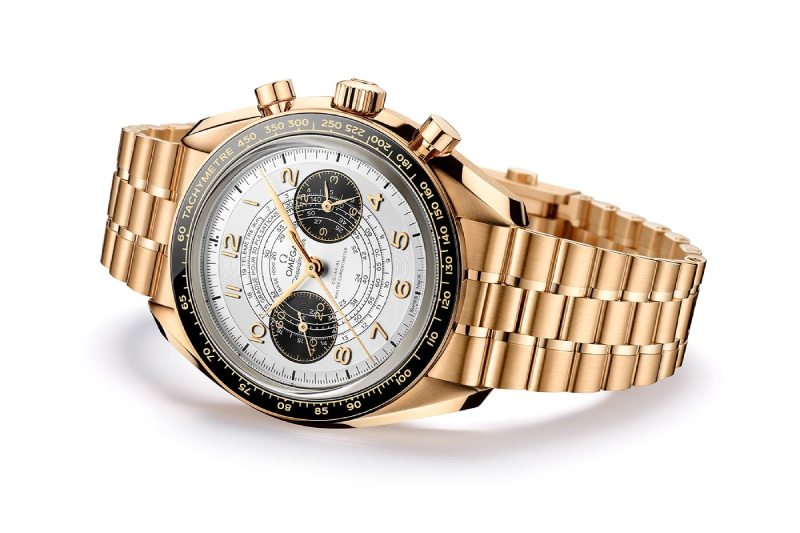 En ambas variaciones del Omega Speedmaster Chronoscope, las especificaciones son las mismas. En el exterior nos encontramos una caja clásica en 43mm con un bisel de aluminio anodizado en negro. Dentro, nos encontramos el calibre de movimiento automático 9908 Co-Axial Chronometer con complicación de cronógrafo. Y ahora es cuando las cosas se ponen especiales. La esfera blanca de opalina está dispuesta a manera de caracol (una referencia a los modelos de 1490) gracias a la superposición de las diferentes escalas, que cambian de color cuando llegamos a las subesferas a contraste del chrono. Los indicadores arábigos en ambas piezas se rematan en Moonshine Gold, al igual que todas las agujas.