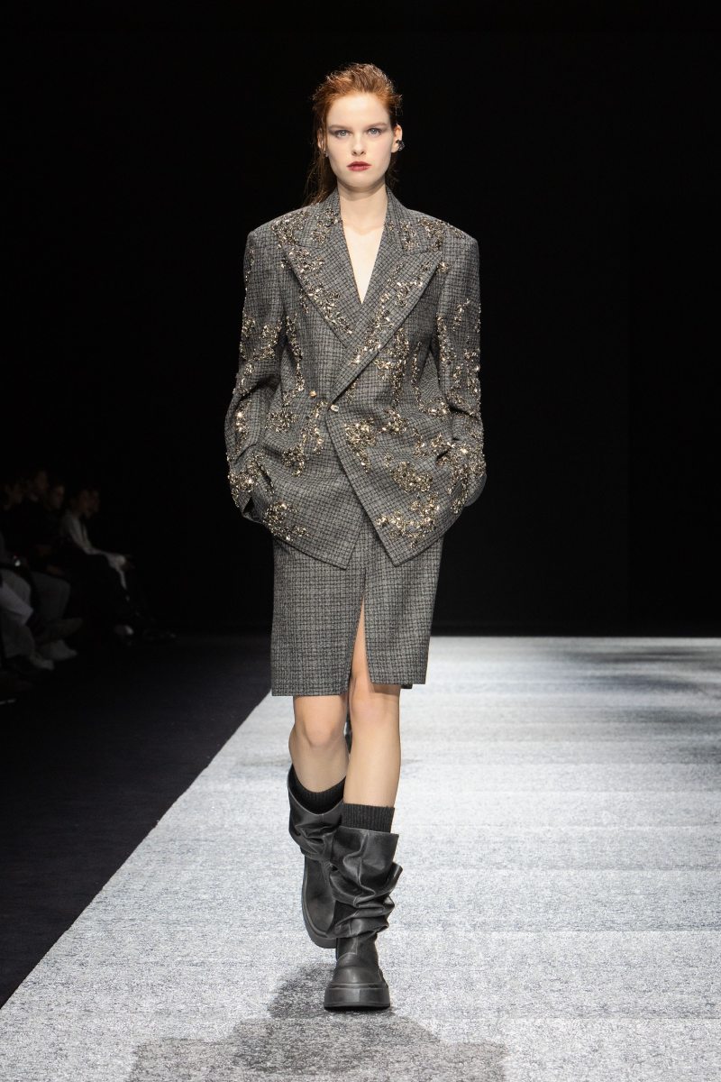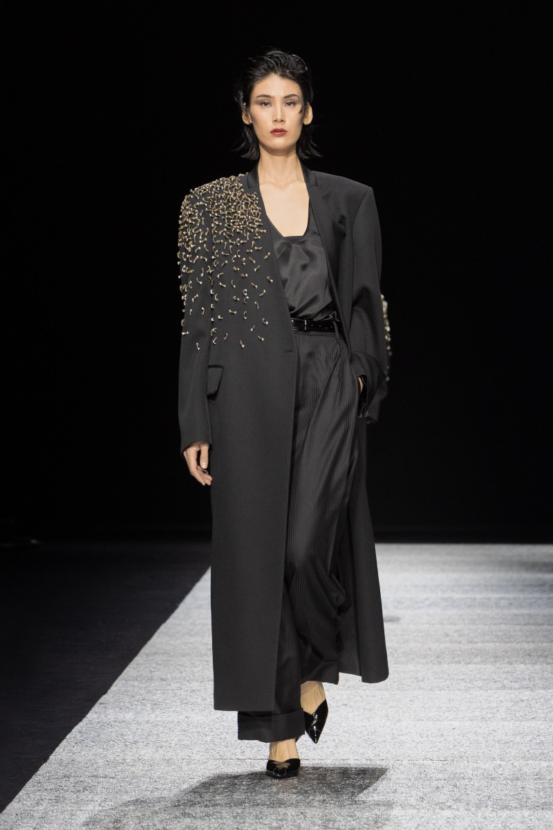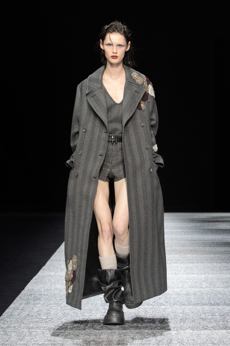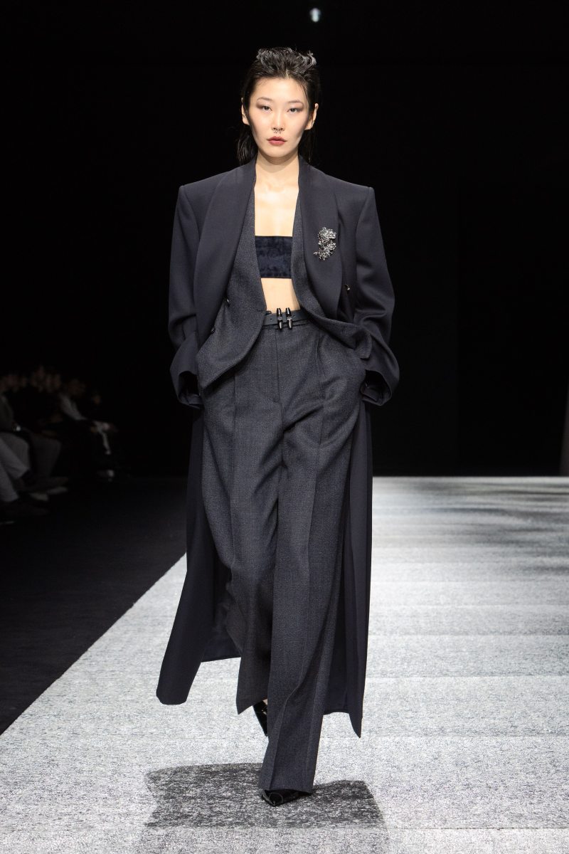 En la impecable colección Emporio Armani FW24/25, se despliega un espíritu audaz. Esto se manifiesta a través de siluetas definidas, con hombros anchos y grandes volúmenes. Los looks se anclan al suelo mediante zapatos formales de suelas anchas y botas blandas combinadas con polainas. Estilos portuarios destacan con abrigos largos, chaquetas y pantalones de volúmenes generosos.