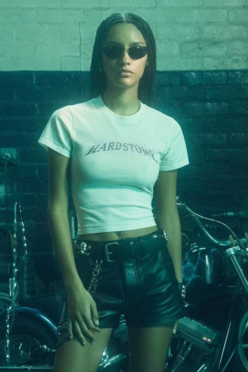 En cuanto al denim, Hardstone Hardware mira a los moteros con total looks vaqueros de corte oversize y chalecos utility con su buena dosis de bolsillos extra. También vemos jorts de corte baggy y shorts de corte vaquero en piel. Siguiendo esta línea, vemos camisetas y sudaderas gráficas cargadas de este tipo de iconografía con detalles desgastados y lavados desvanecidos. Y, como piezas más Y2k, tenemos camisetas con el logo de la firma rematado con pedrería brillante. Y hay un poco de chándal también y camisas a cuadros, como base más esencial.