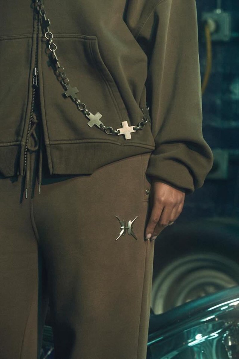 Pasando a los accesorios, la marca de ropa de Don Toliver no se queda nada corta. Inspirada en esa estética de los clubes moteros, muchos de los looks se decoran con cadenas plateadas (de estilo wallet chain) y collares con la misma estética. También vemos gorras con herrajes de H para rematar estos looks.