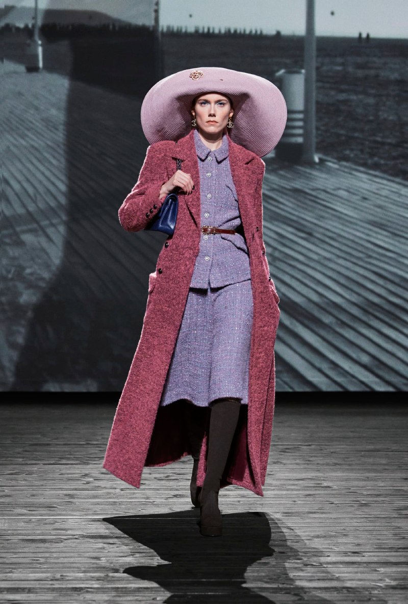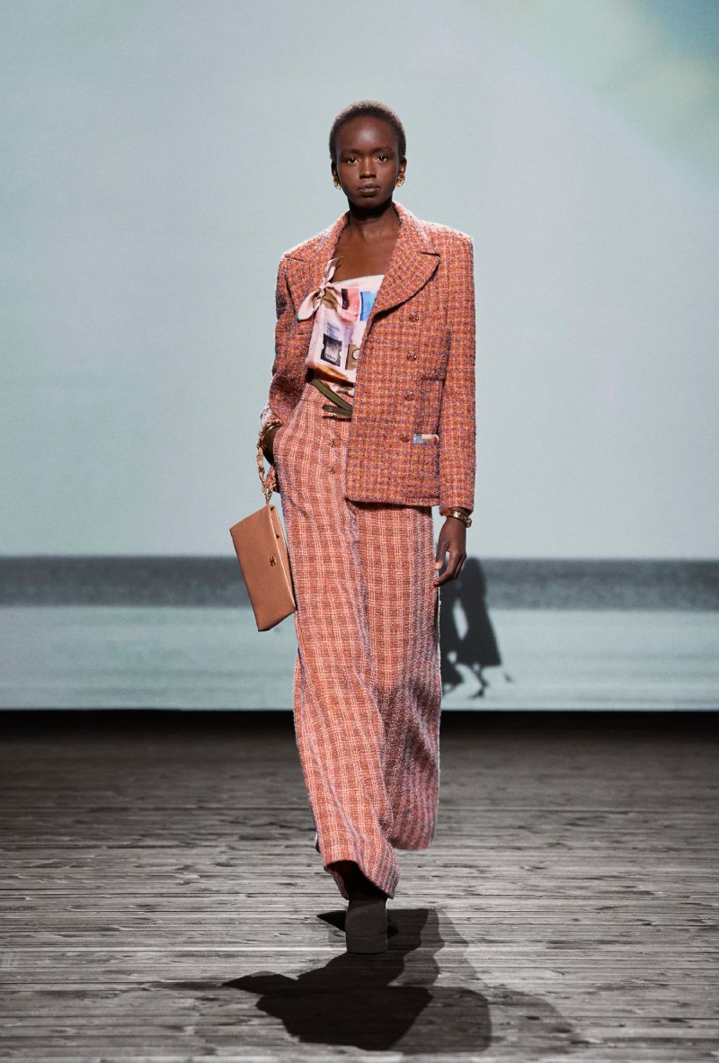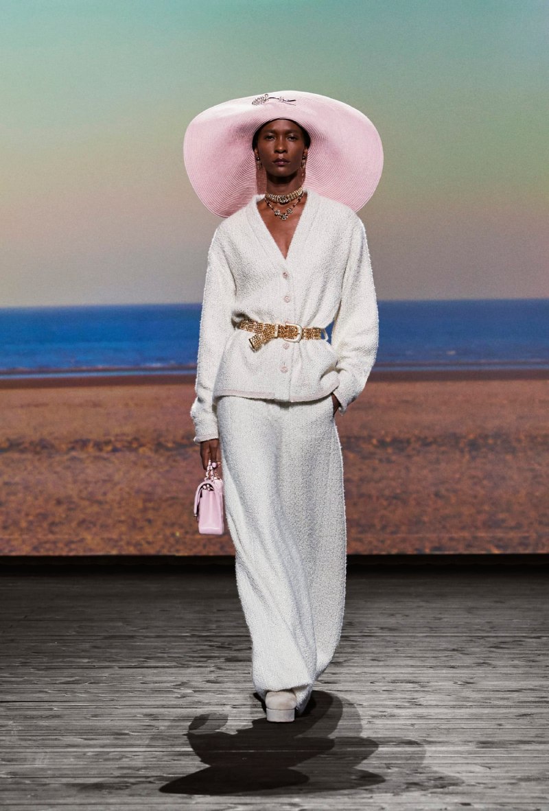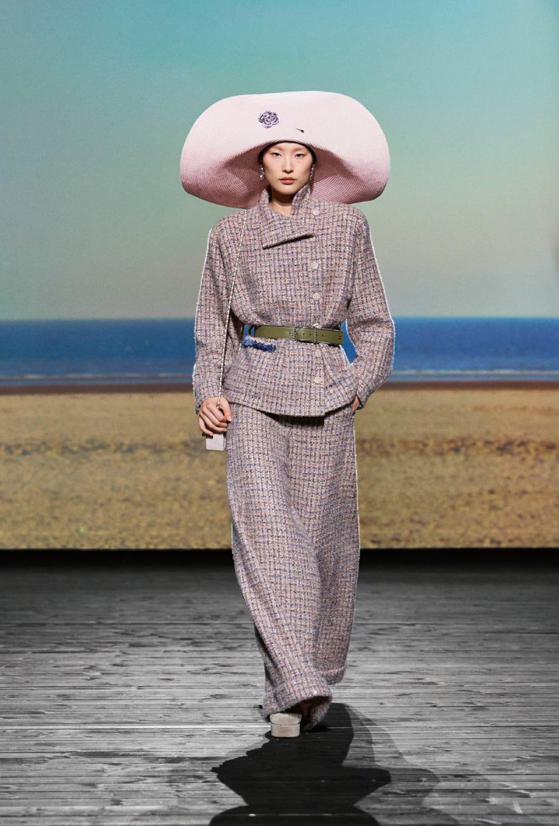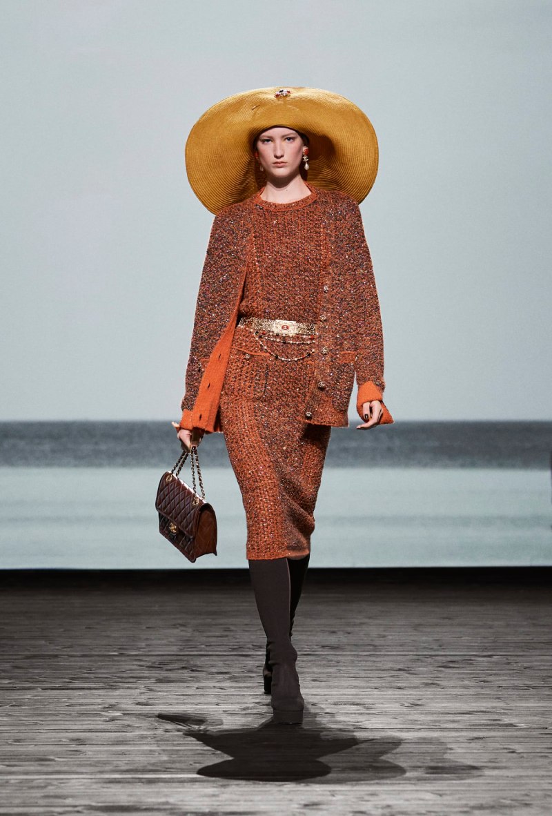 Mucha de la obra de Viard se basa en una retrospectiva de la vida de Gabrielle, pero Chanel FW24 lo lleva un paso más allá mirando a la primerísima tienda de la Maison: la boutique de sombreros en Deauville. Además, toma inspiración de su armario personal y de la escenografía natural del pueblo para crear un armario de tonos cálidos que mezcla estilos de los años 20 con los 70.