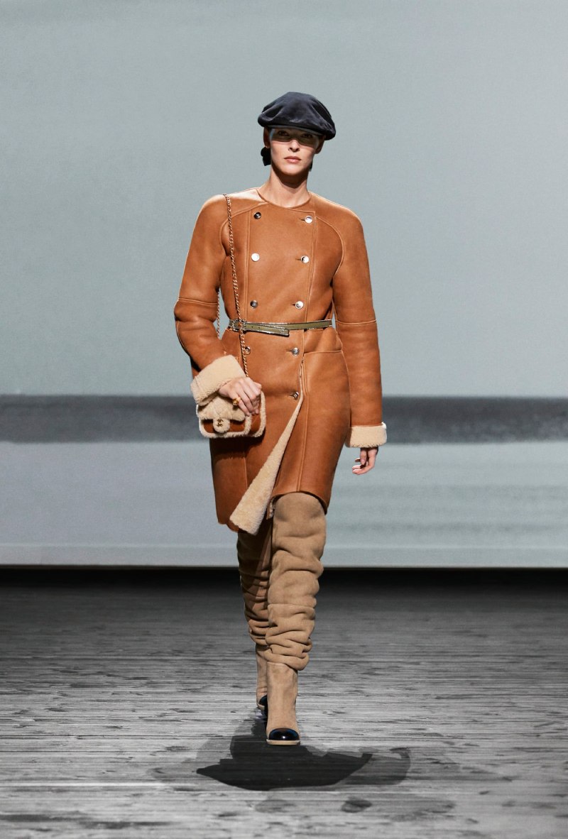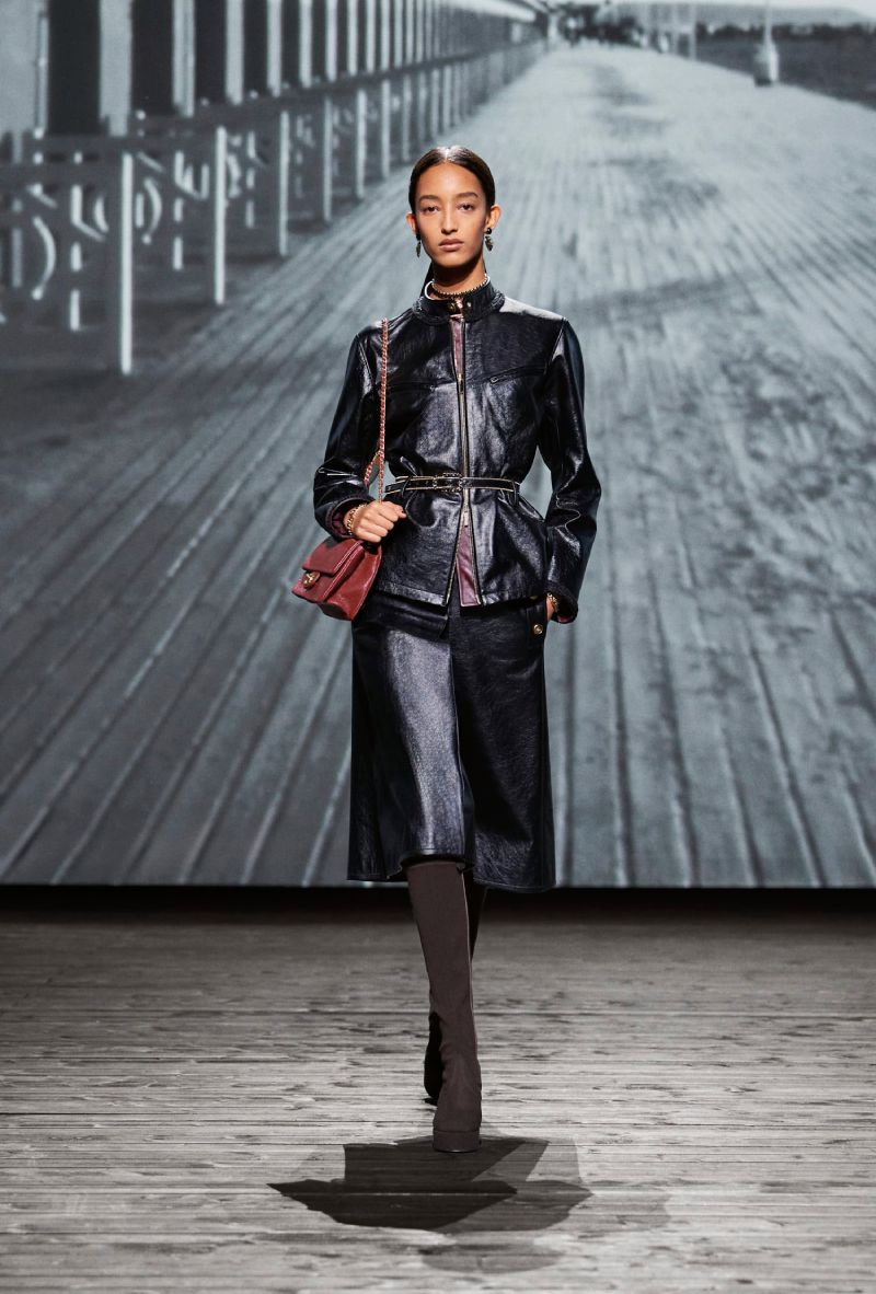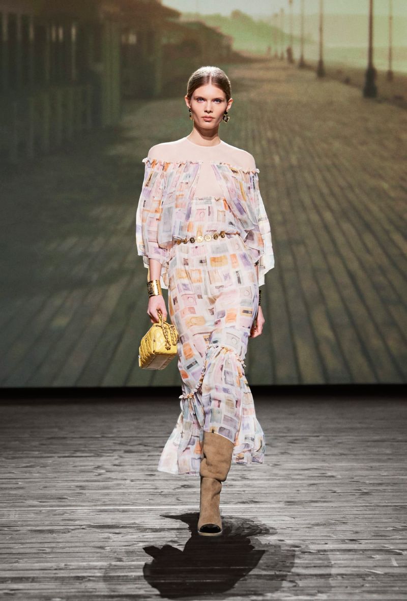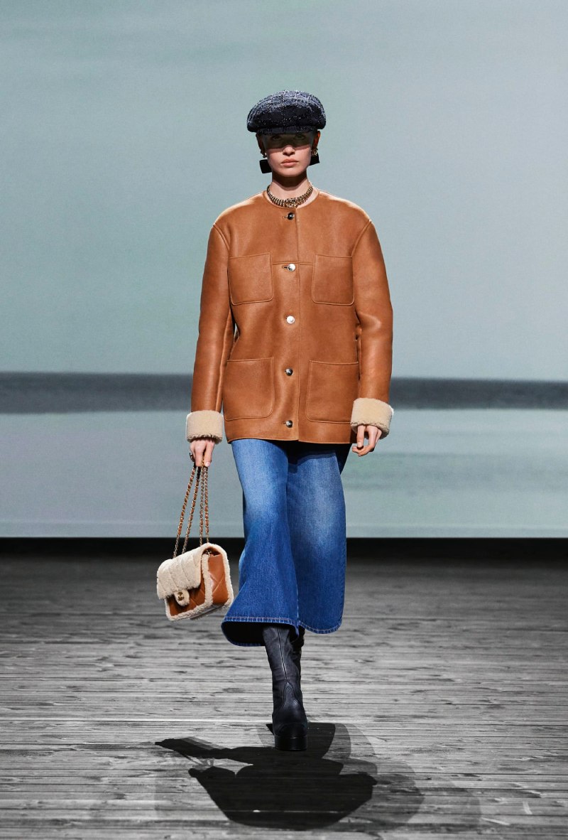 Mucha de la obra de Viard se basa en una retrospectiva de la vida de Gabrielle, pero Chanel FW24 lo lleva un paso más allá mirando a la primerísima tienda de la Maison: la boutique de sombreros en Deauville. Además, toma inspiración de su armario personal y de la escenografía natural del pueblo para crear un armario de tonos cálidos que mezcla estilos de los años 20 con los 70.
