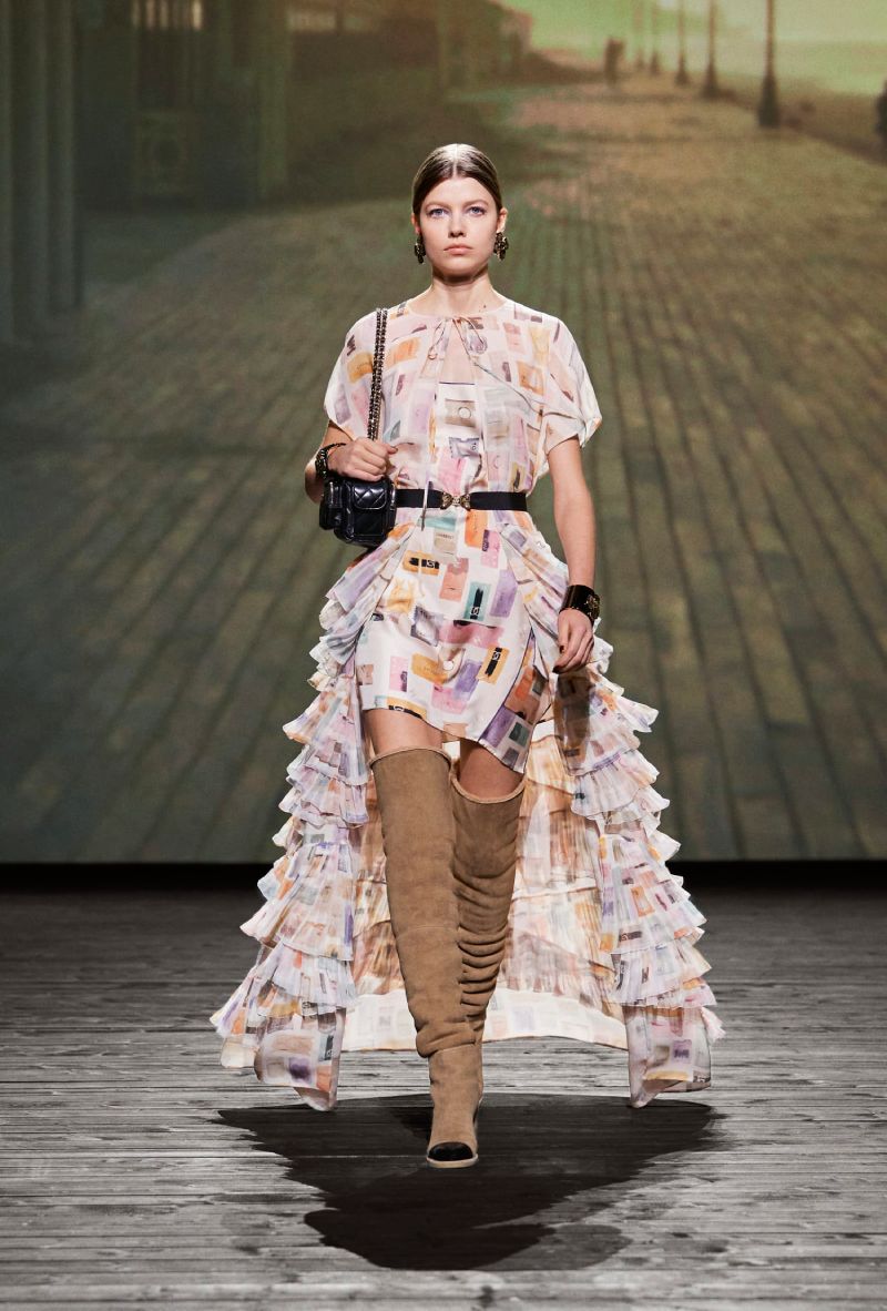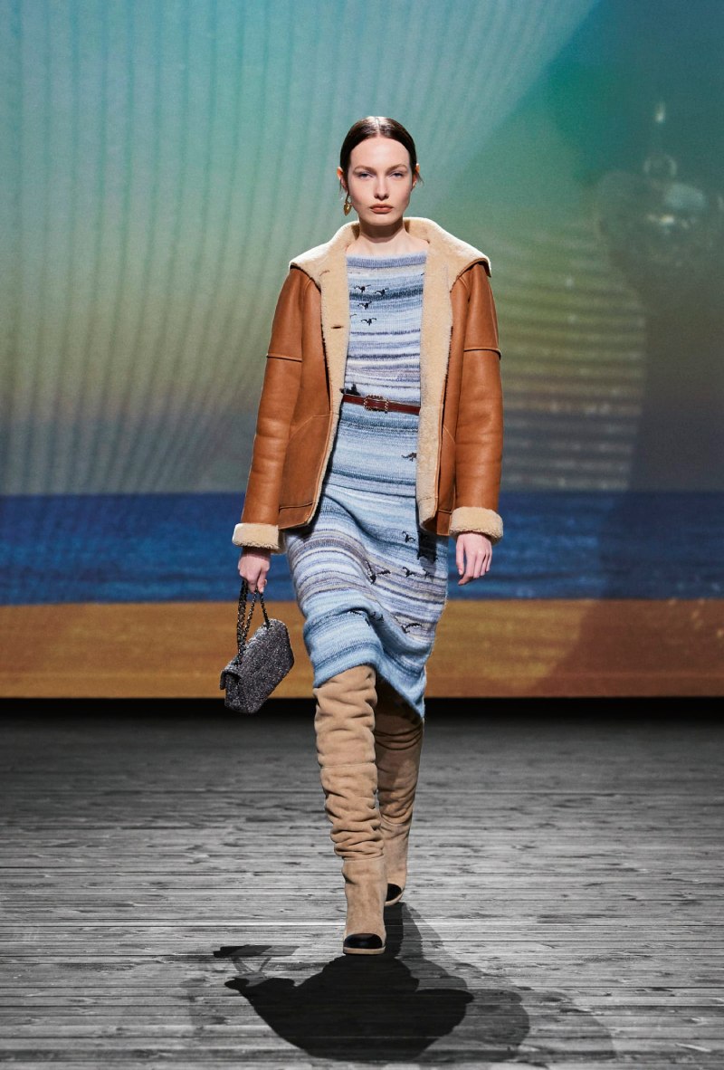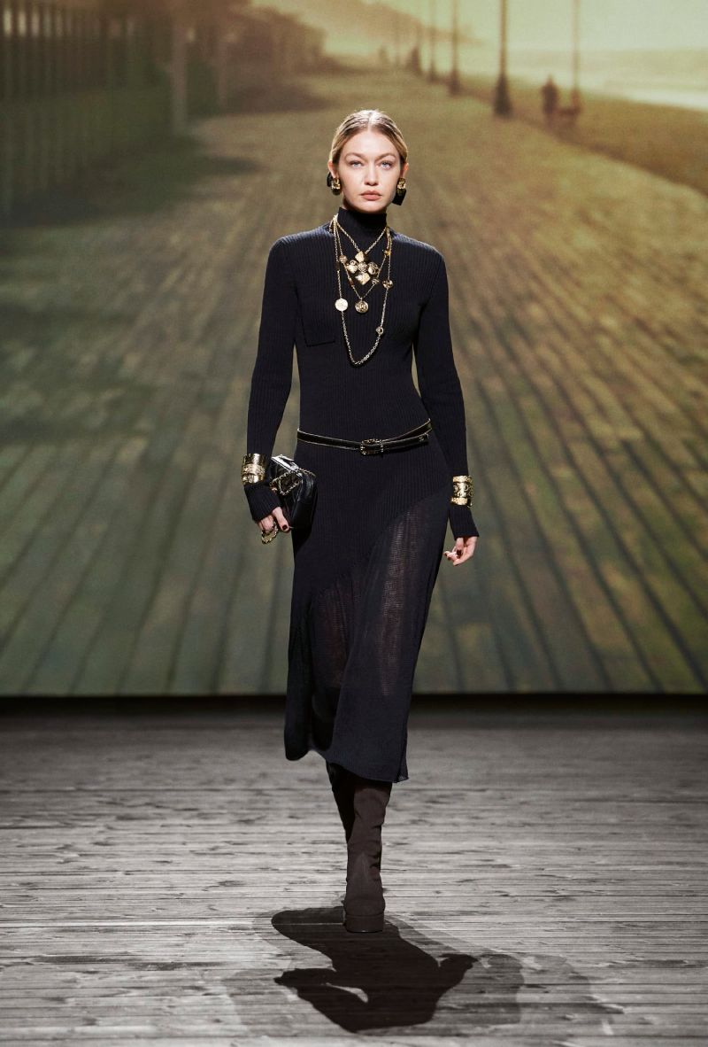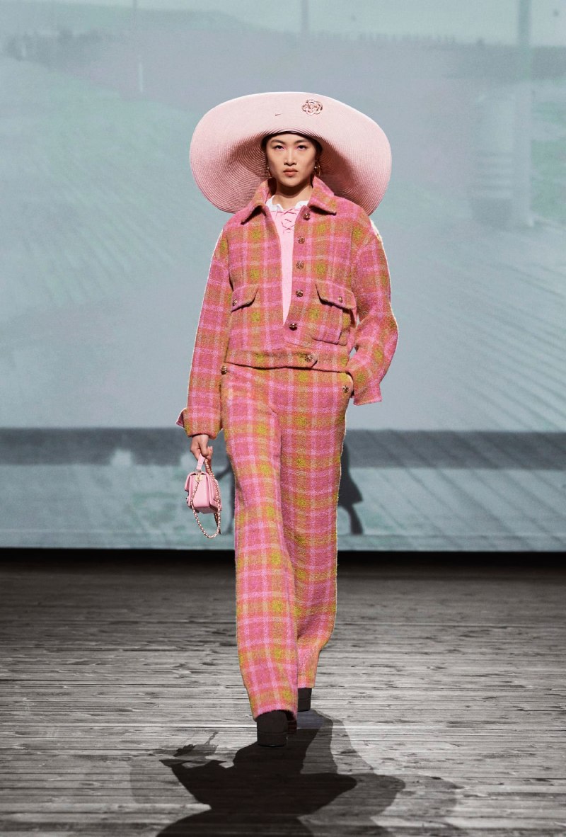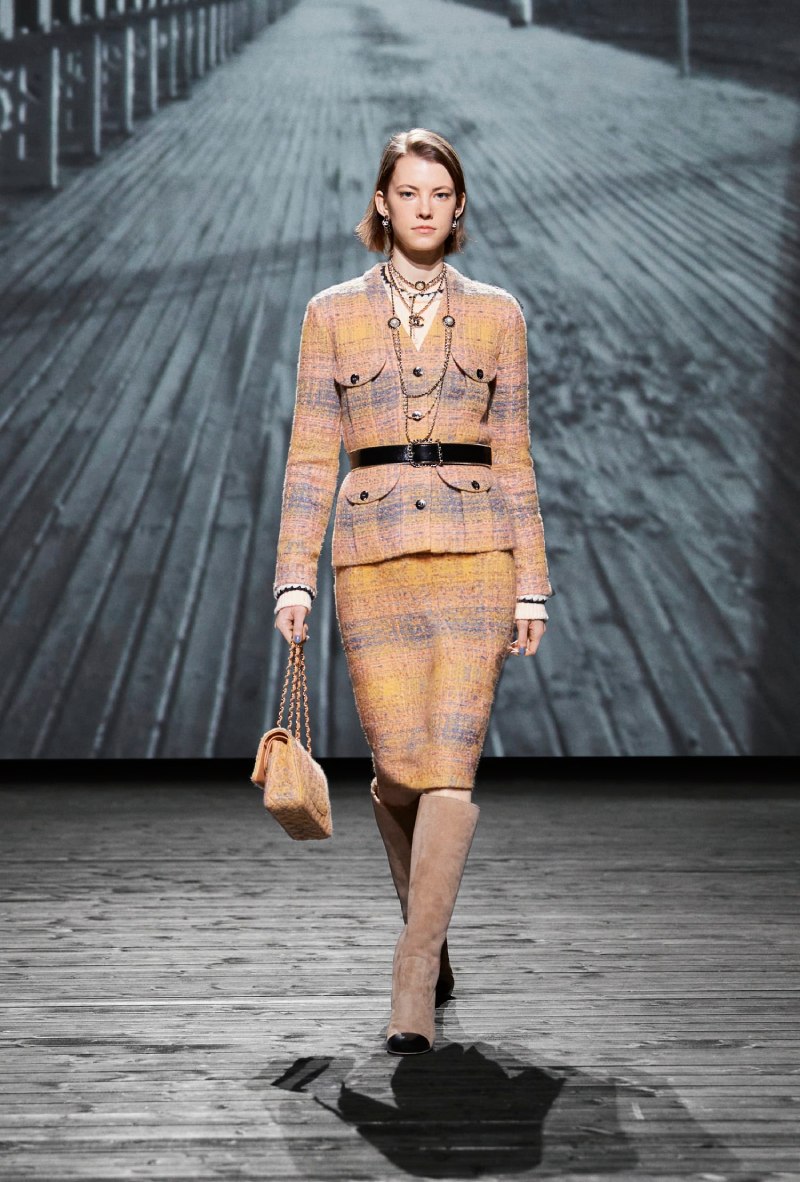 Mucha de la obra de Viard se basa en una retrospectiva de la vida de Gabrielle, pero Chanel FW24 lo lleva un paso más allá mirando a la primerísima tienda de la Maison: la boutique de sombreros en Deauville. Además, toma inspiración de su armario personal y de la escenografía natural del pueblo para crear un armario de tonos cálidos que mezcla estilos de los años 20 con los 70.