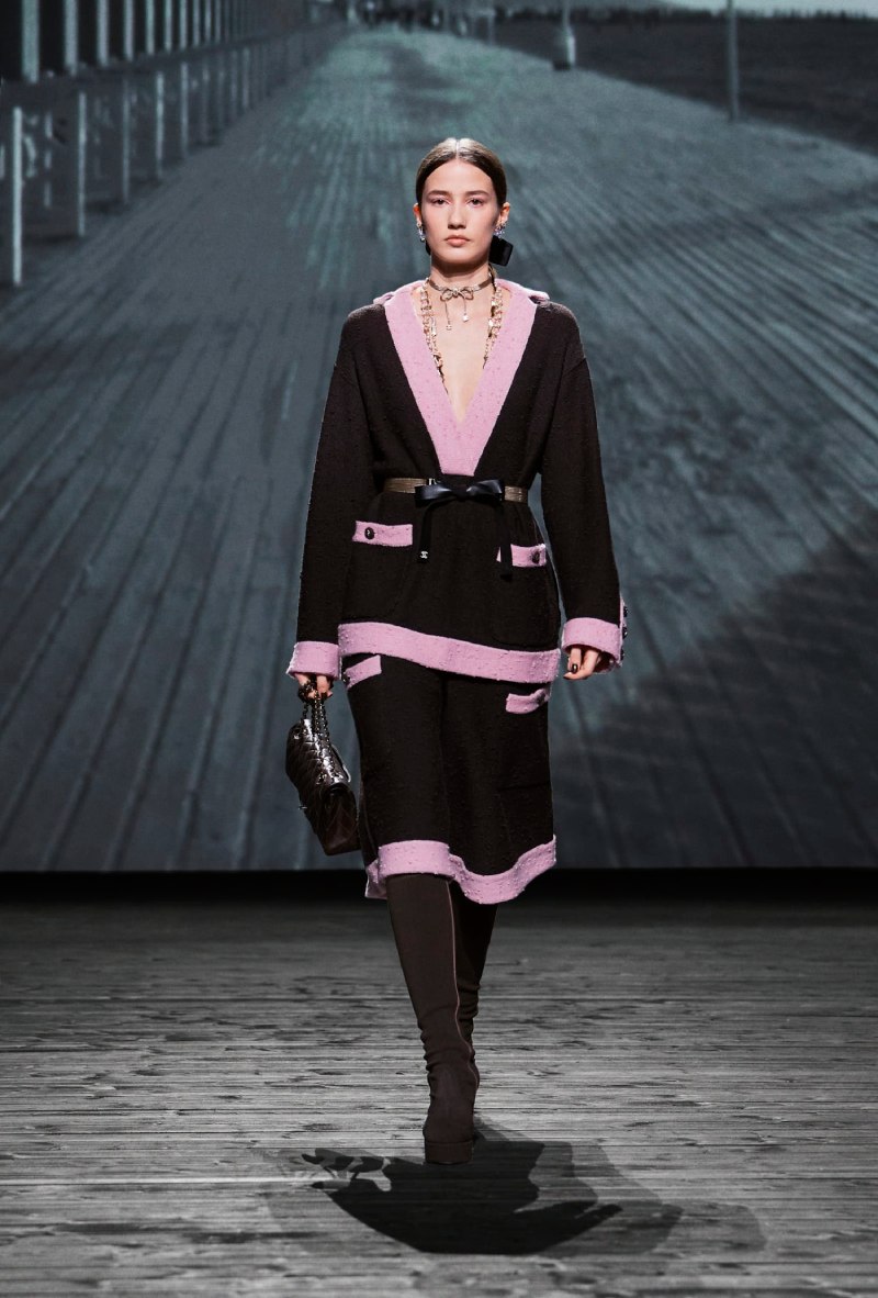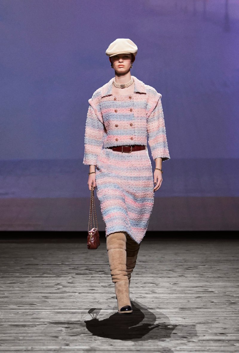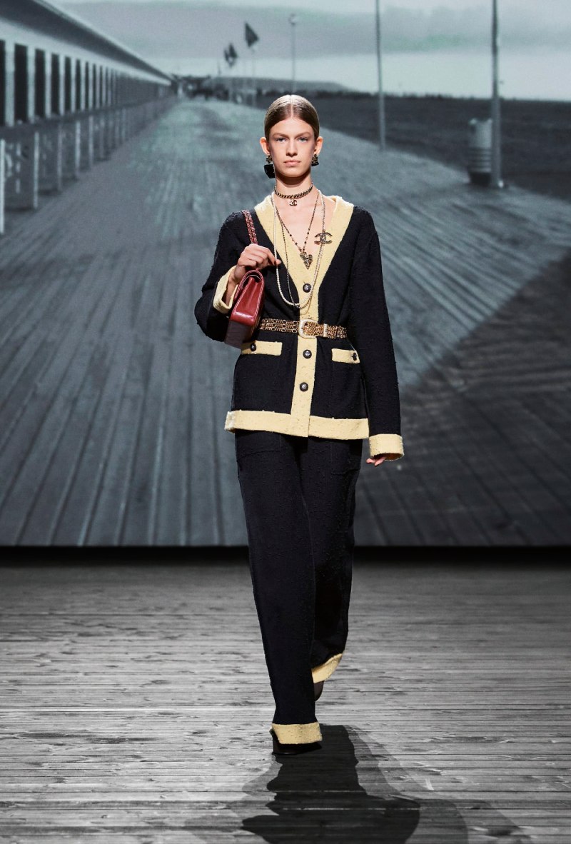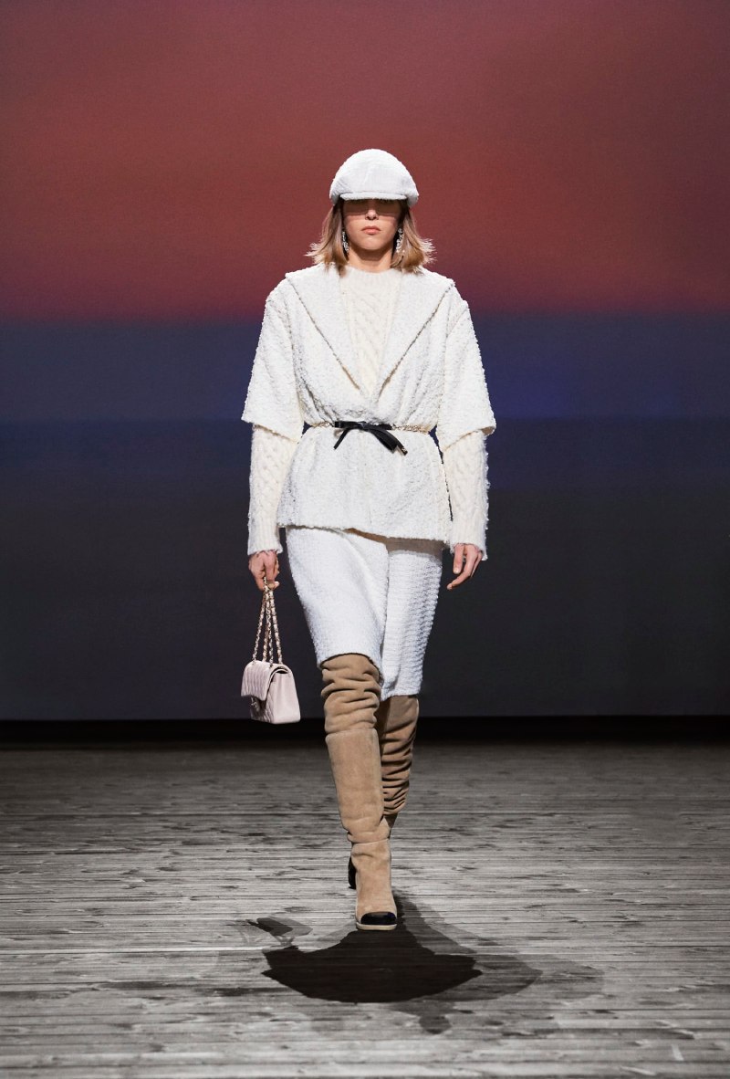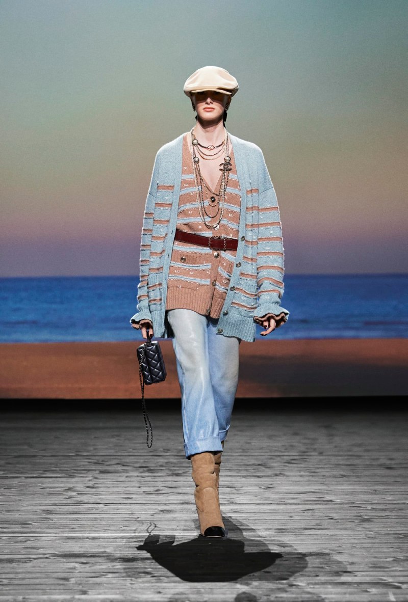 Trajes icónicos de chaqueta y falda, cárdigans y jerséis de marinero sirven para aportar aún más textura al asunto. Trajes Chanel con cuellos camiseros de los 70 y abrigos largos con degradados de atardecer conducen a los estilos más casuales, compuestos por jeans y cárdigans de corte relajado. Como pieza a destacar, tenemos un abrigo puffer decorado con una camelia blanca como pieza de high street.