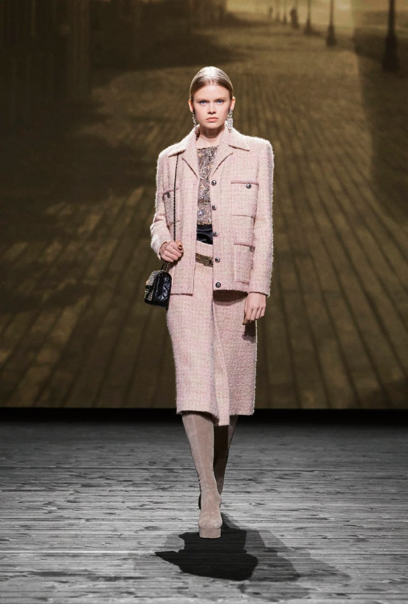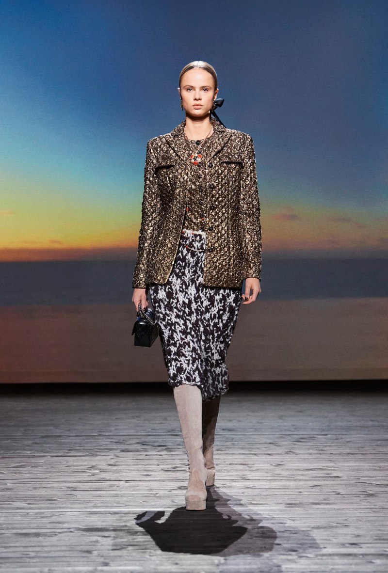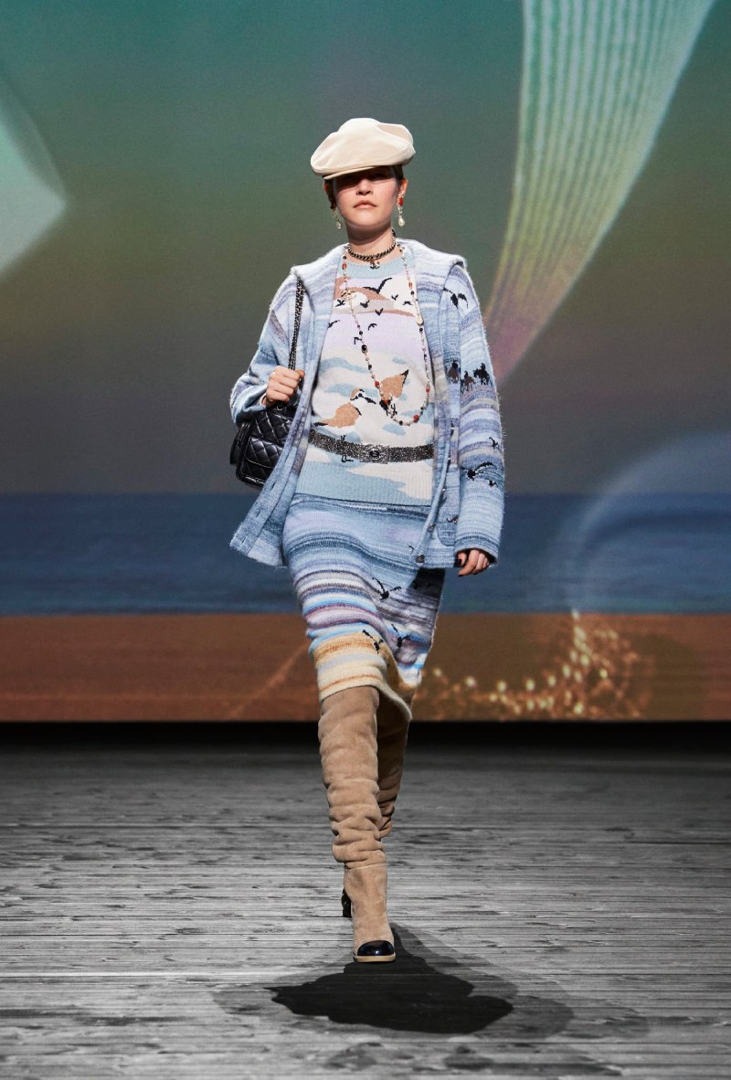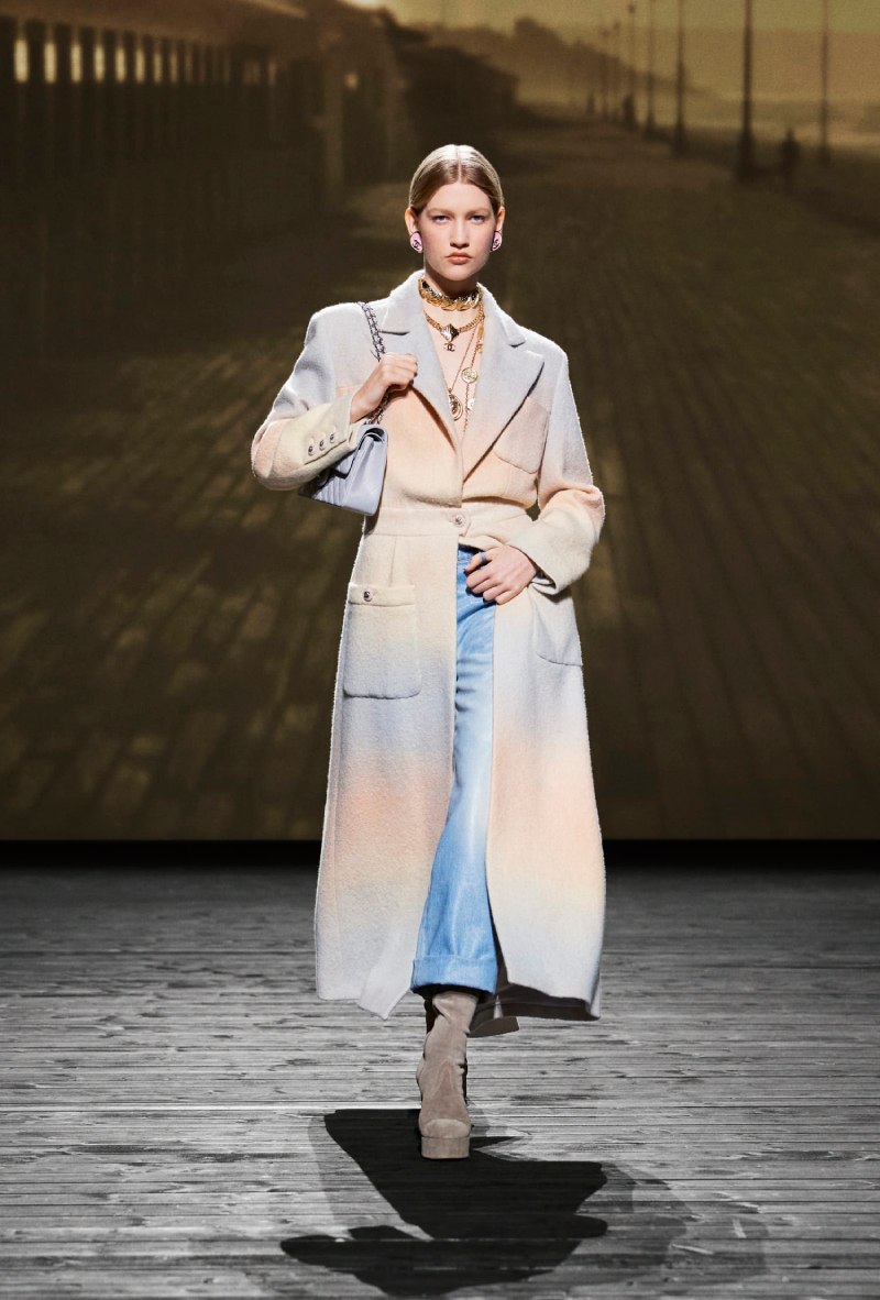 Trajes icónicos de chaqueta y falda, cárdigans y jerséis de marinero sirven para aportar aún más textura al asunto. Trajes Chanel con cuellos camiseros de los 70 y abrigos largos con degradados de atardecer conducen a los estilos más casuales, compuestos por jeans y cárdigans de corte relajado. Como pieza a destacar, tenemos un abrigo puffer decorado con una camelia blanca como pieza de high street.