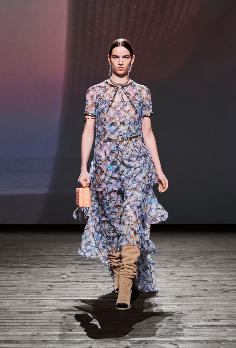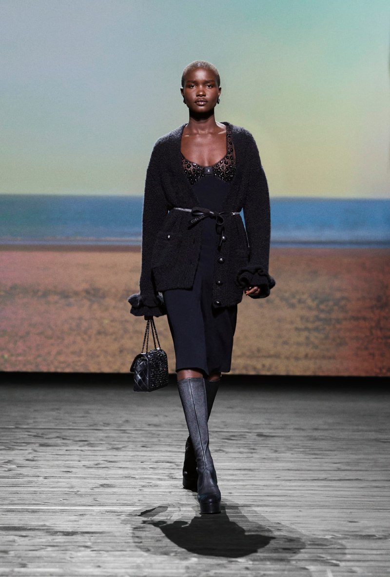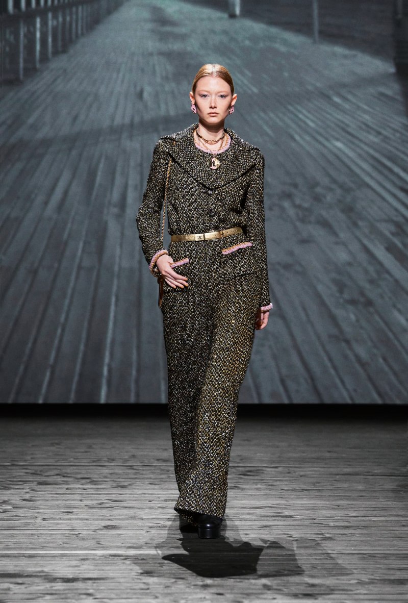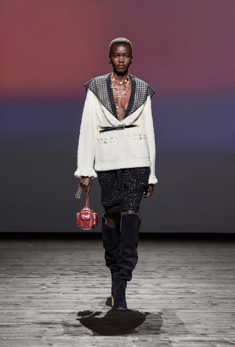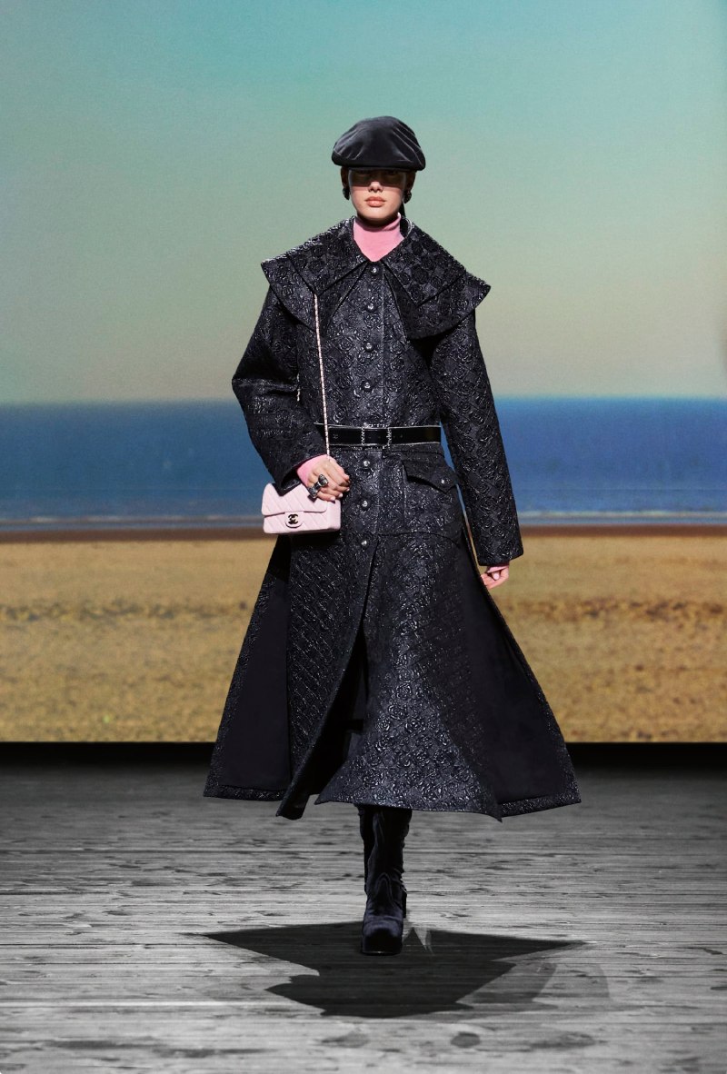 Trajes icónicos de chaqueta y falda, cárdigans y jerséis de marinero sirven para aportar aún más textura al asunto. Trajes Chanel con cuellos camiseros de los 70 y abrigos largos con degradados de atardecer conducen a los estilos más casuales, compuestos por jeans y cárdigans de corte relajado. Como pieza a destacar, tenemos un abrigo puffer decorado con una camelia blanca como pieza de high street.