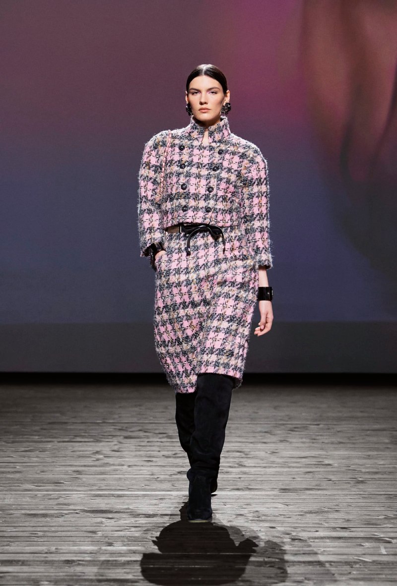 Para esta nueva entrega, Viard mira única y exclusivamente a los códigos fundamentales de la Maison. Abriendo Chanel FW24 vemos cómo el outerwear se vuelve más delicado con el uso de icónicos patrones de tweed y colores menos invernales. Sin embargo, esto se balancea con siluetas rígidas de hombros anchos y masculinos.