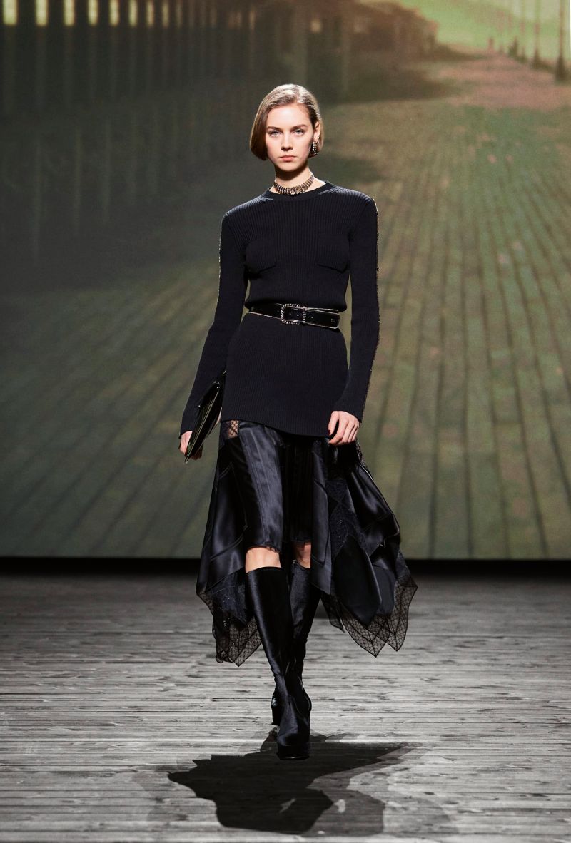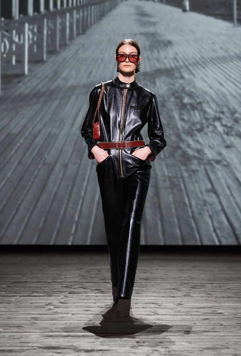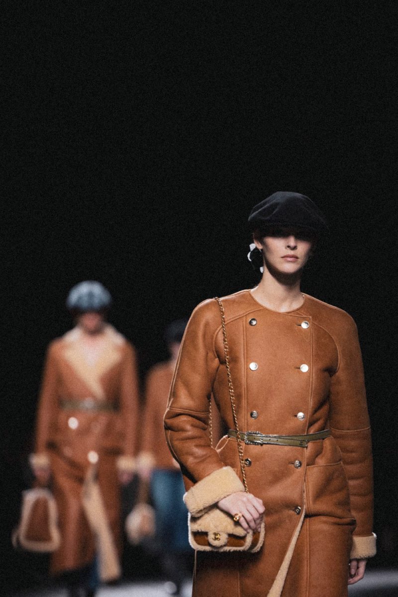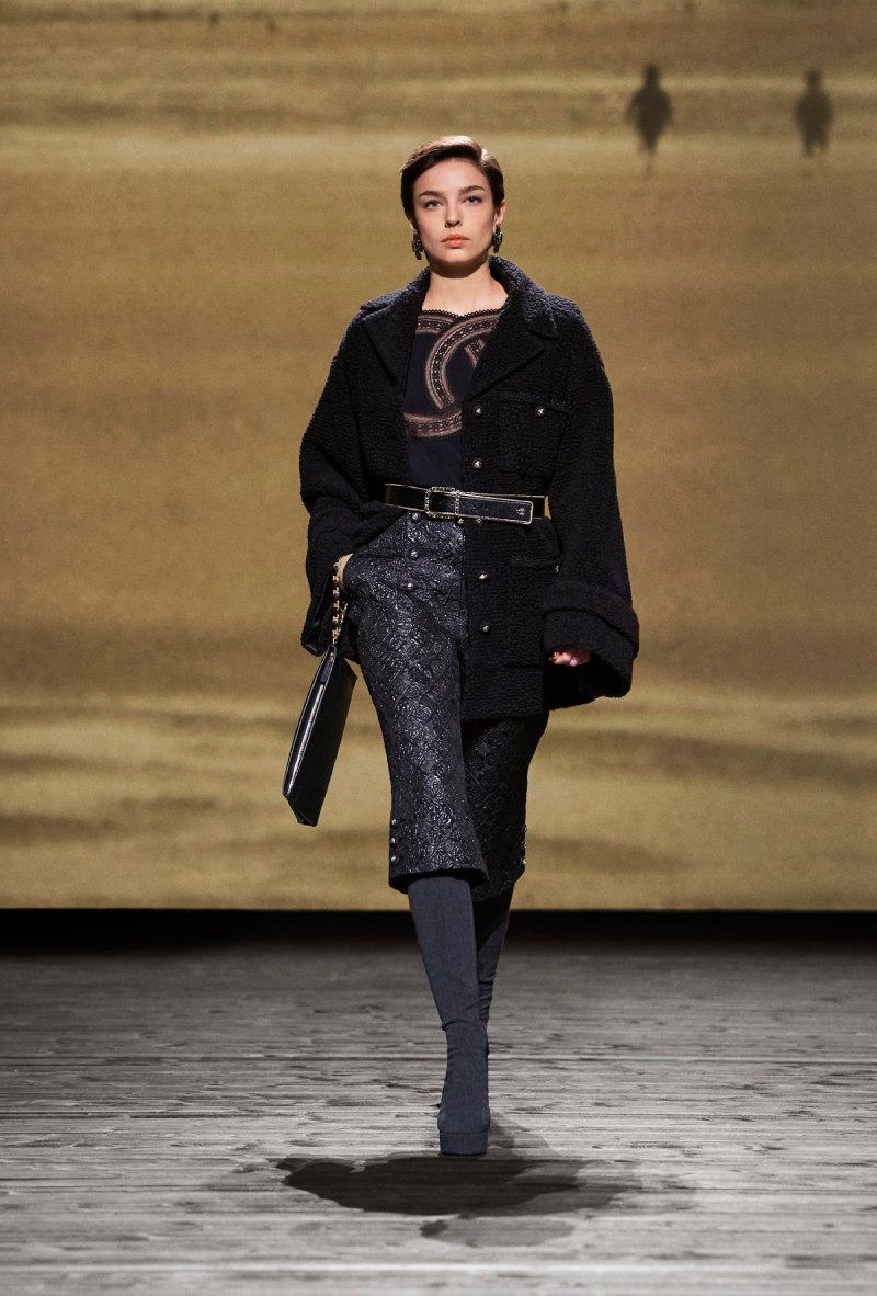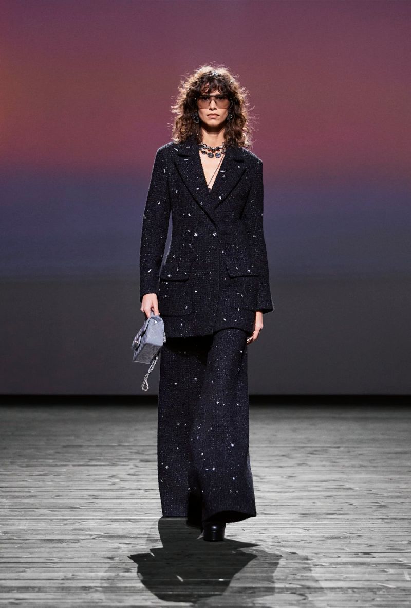 En una nota más western, Chanel FW24 mira a la mítica chaqueta de shearling para constituir abrigos de inspiración menswear. Versiones revisitadas del conjunto de tweed cierran los looks de día. Y para la noche, la selección abre con trajes casuales de inspiración sartorial masculina, con culottes no pinzas, monos de cuero y vestidos estampados con mucho vuelo en los bajos. Y para cerrar, un vestido midi con falda plisada en seda negra.