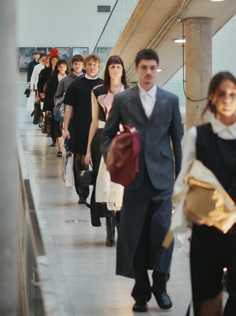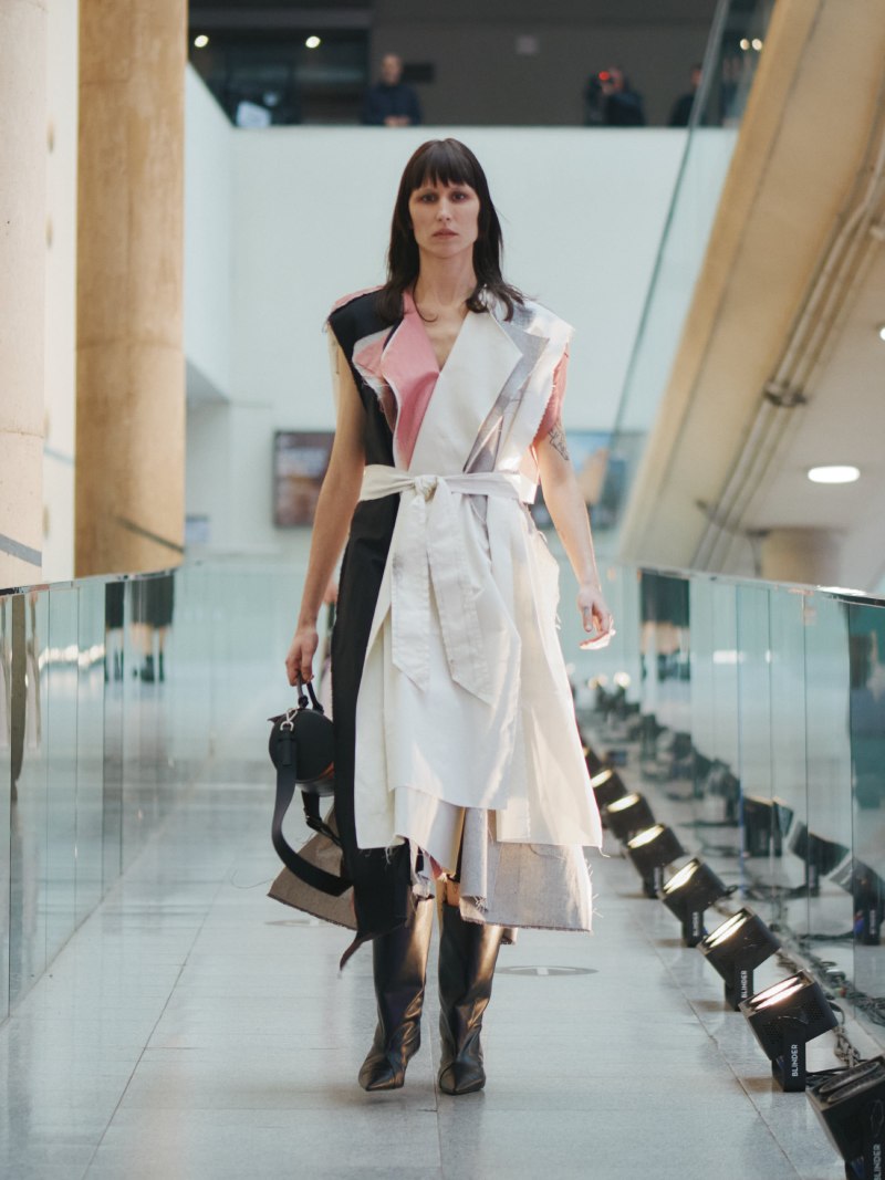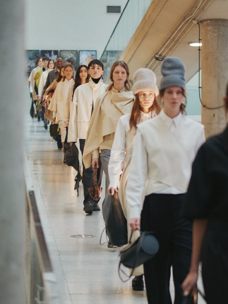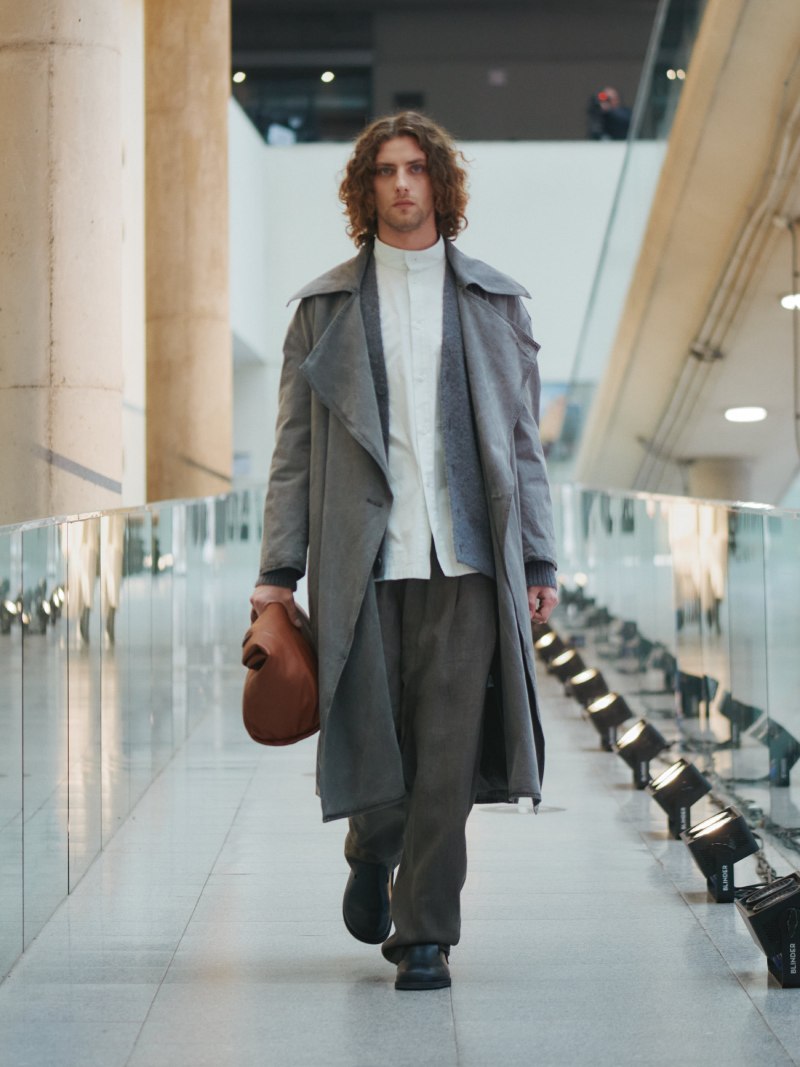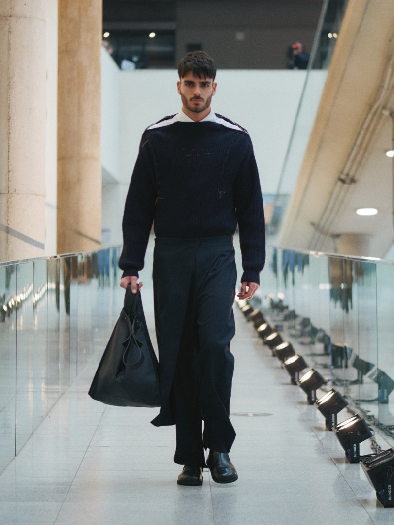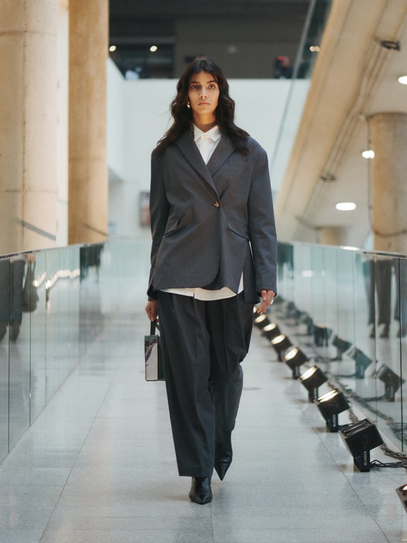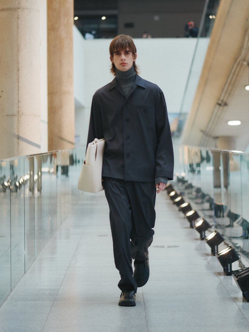 En el terreno de los accesorios, Adolfo Domínguez FW24 enfila en la misma dirección. Las estrellas de este nuevo repertorio son los bolsos de piel, despojados de cualquier elemento innecesario y regidos por un impecable sentido de lo atemporal. En una nota más boho, tenemos bolsos capazo y de malla de pescador, que añaden texturas más ricas a la cuestión. El calzado, tanto el formal como el sport, no se alejan demasiado de este terreno japo-minimal. Y, como puntos de acento, tenemos bufandas de lana oversize con aspecto DIY, para aligerar el tono sobrio de los looks.