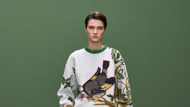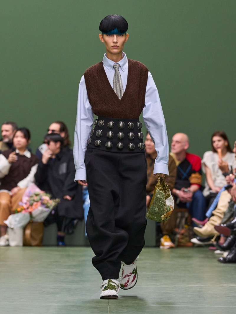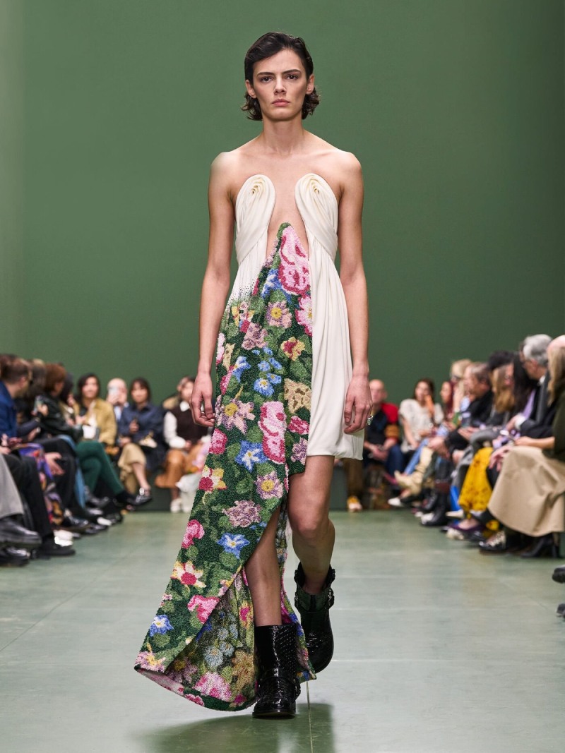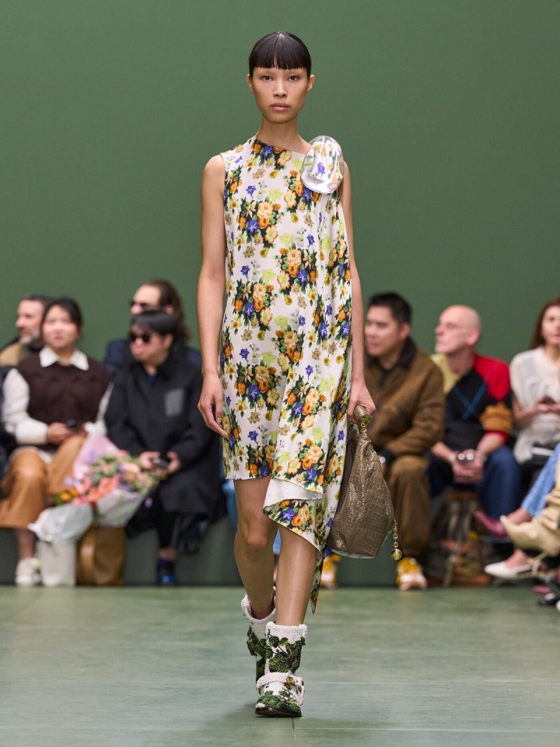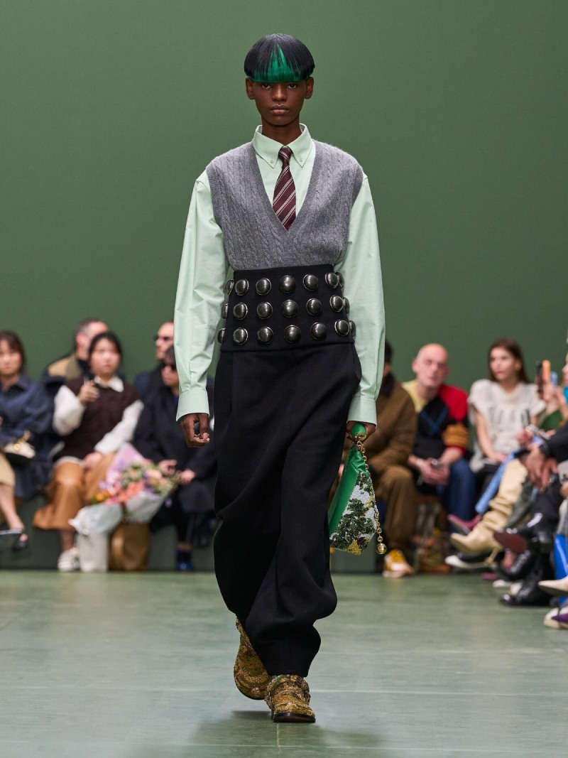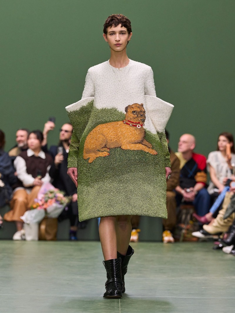 En un terreno menos meta, vemos cómo la influencia de York permea los estampados florales de la propuesta, dispuestos de manera inequívocamente Loewe en los vestidos y demás highlights de la colección. De igual manera, elementos de riqueza y clase sirven para inspirar detalles artesanales, como cuentas de caviar, perros de compañía en motivos de punto, escenas de cacería y tallas de madera convertidas en pelo. Surrealismo en ejecución artesanal en una de las mejores colecciones de Anderson para Loewe.