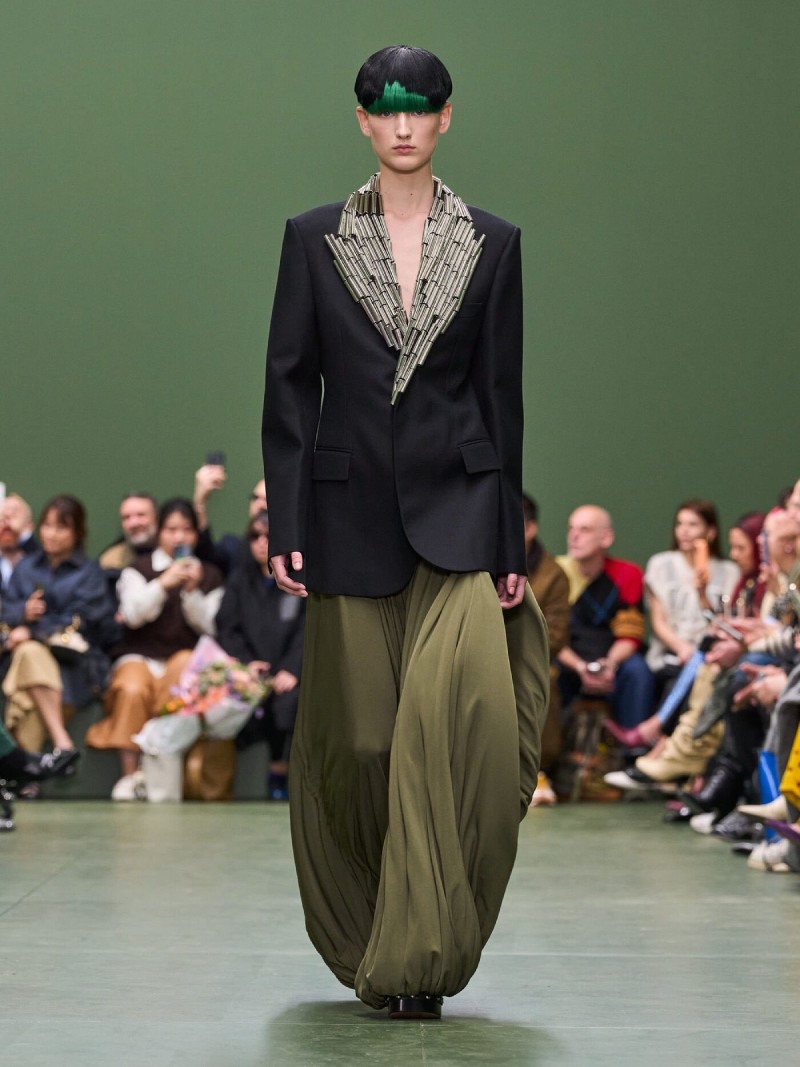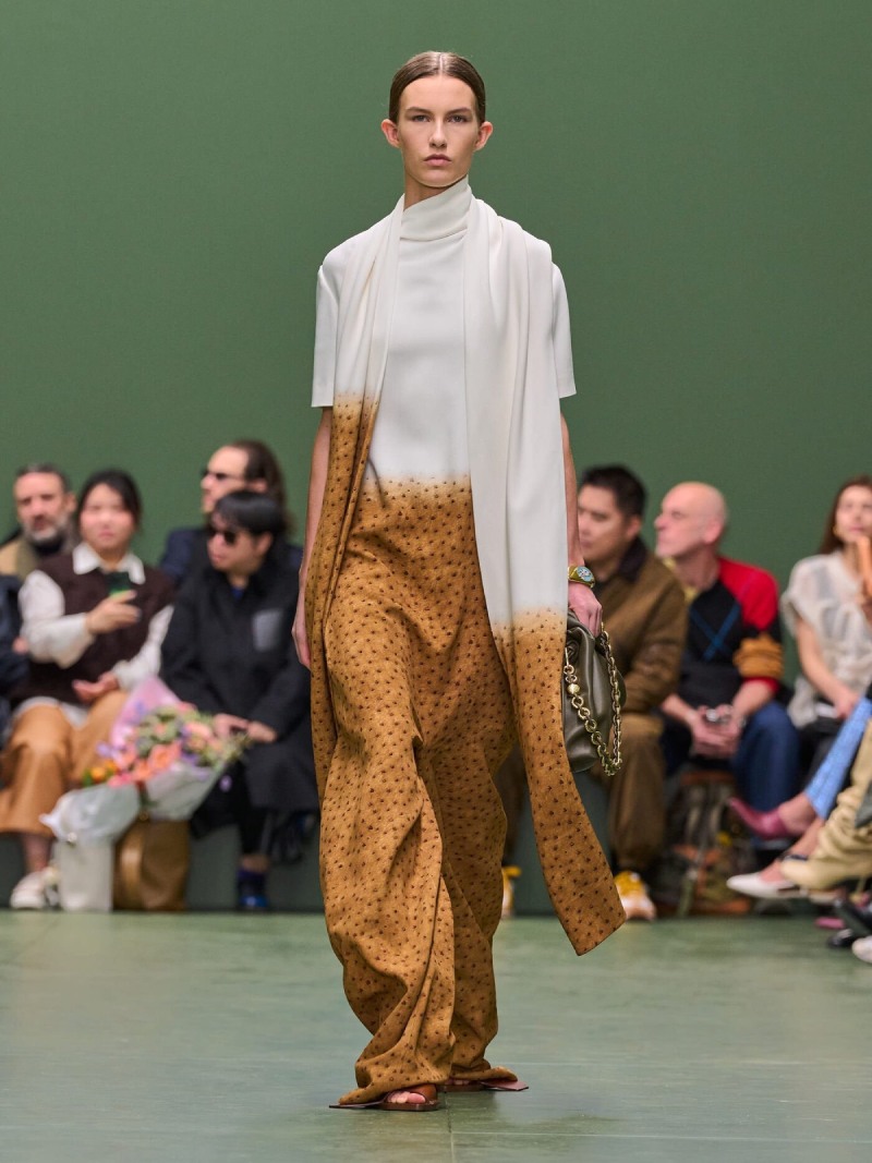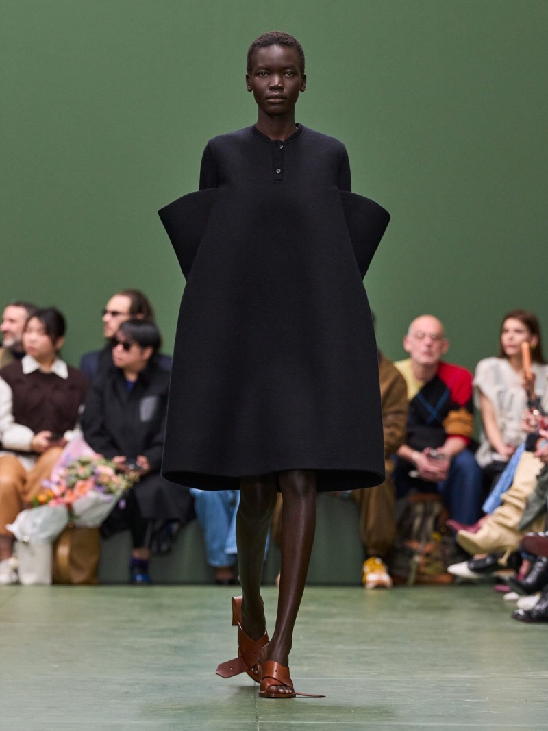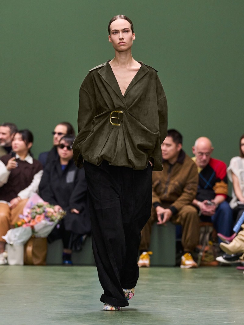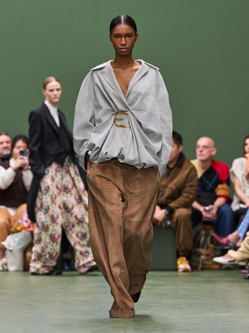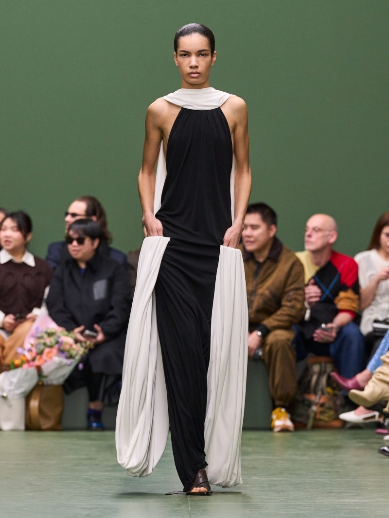 Loewe Mujer FW24 abre con un trío de vestidos drapeados cargados de simbolismo. Una hebilla maxi se encarga de acentuar una construcción minimalista y fluida. Seguidamente, llega el turno de la sastrería: abrigos largos con cuellos de pelo, chaquetas de esmoquin con colas extra largas y pantalones de pinzas altamente voluminosos. Todo, con un fortísimo componente masculino que grita atemporalidad y sofisticación.