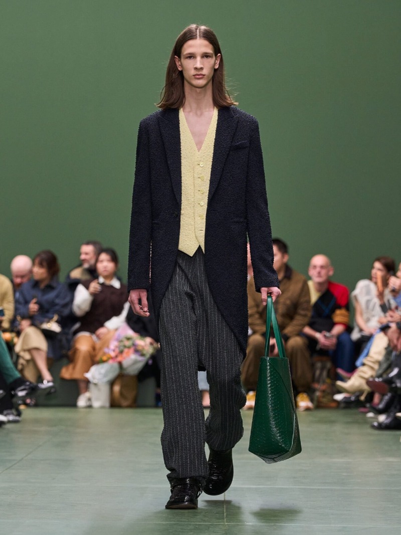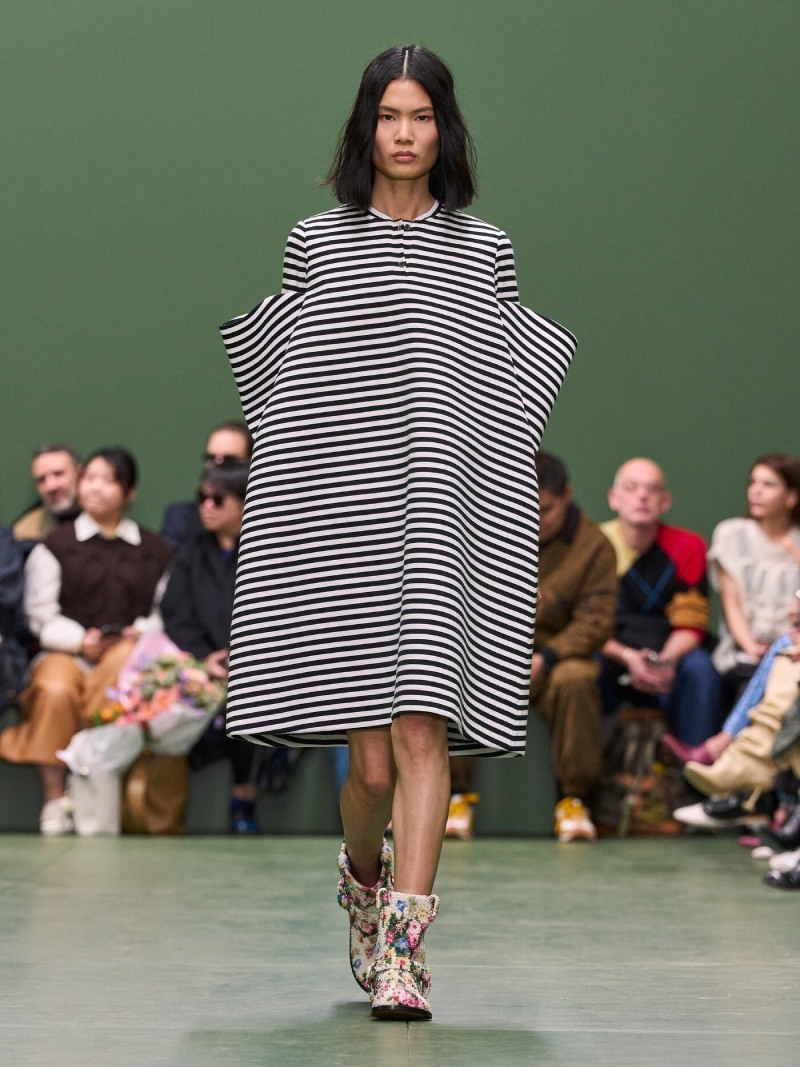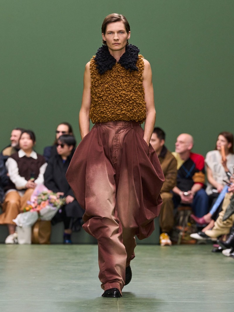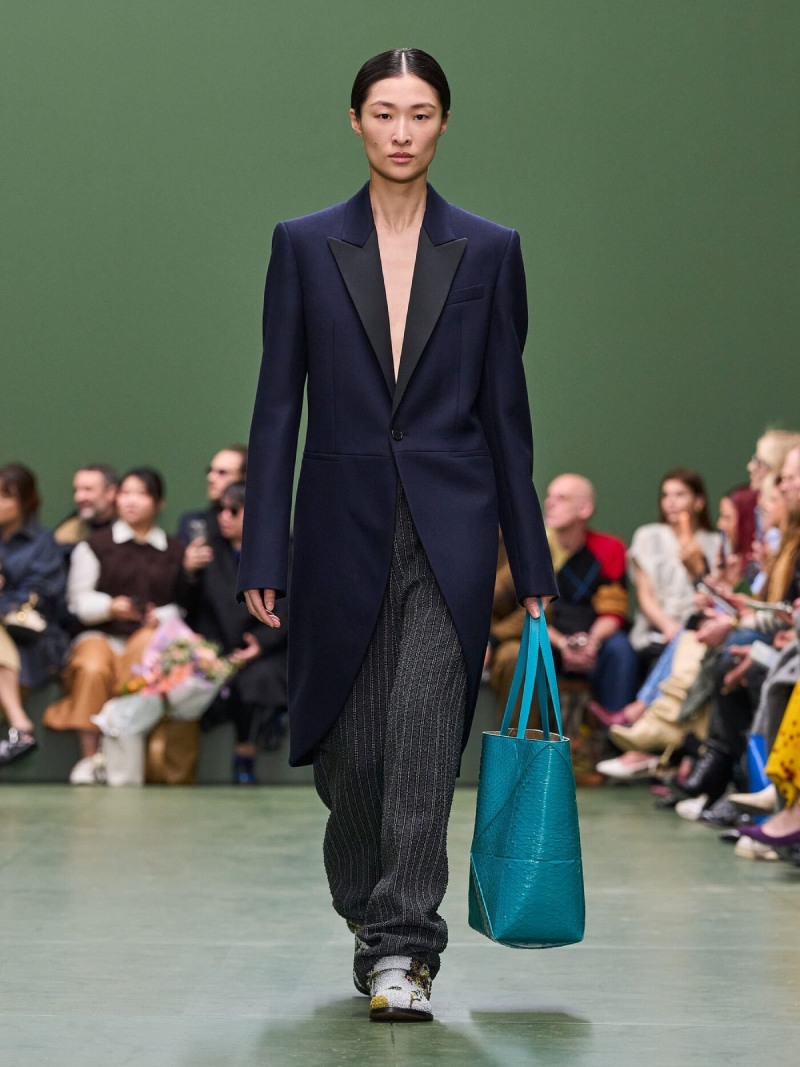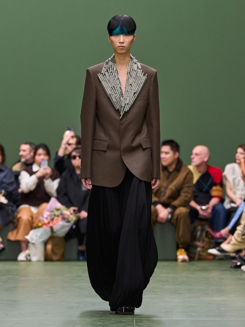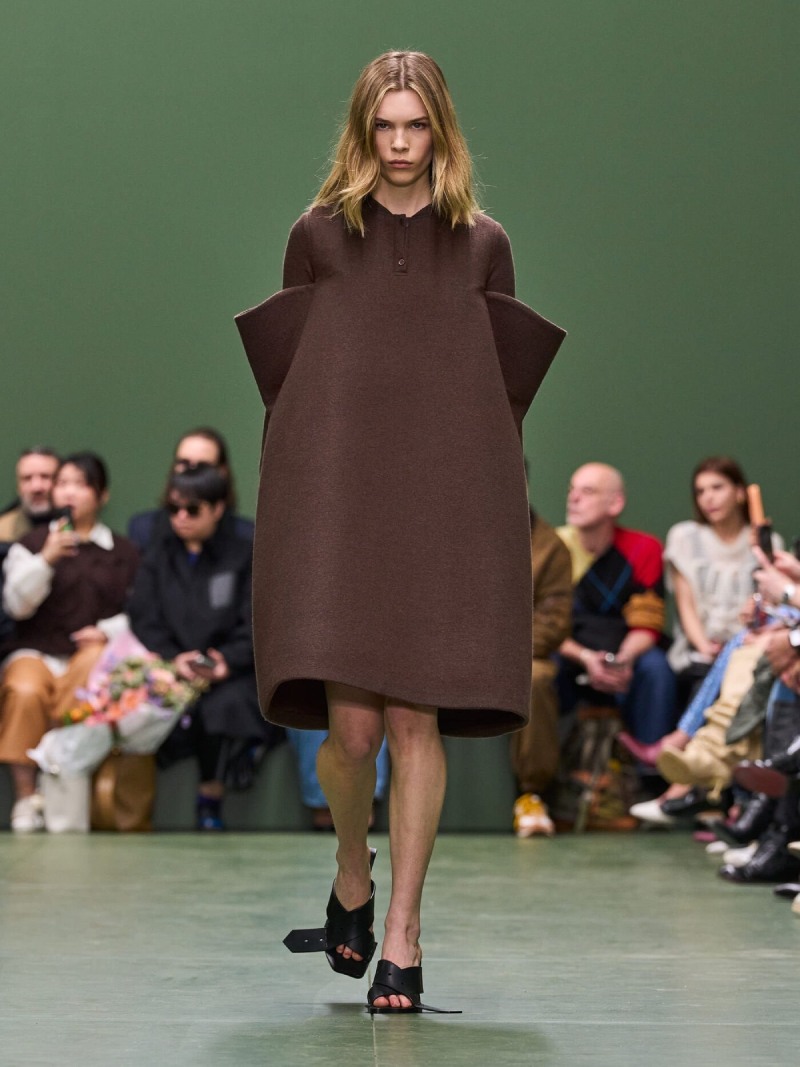 Loewe Mujer FW24 abre con un trío de vestidos drapeados cargados de simbolismo. Una hebilla maxi se encarga de acentuar una construcción minimalista y fluida. Seguidamente, llega el turno de la sastrería: abrigos largos con cuellos de pelo, chaquetas de esmoquin con colas extra largas y pantalones de pinzas altamente voluminosos. Todo, con un fortísimo componente masculino que grita atemporalidad y sofisticación.