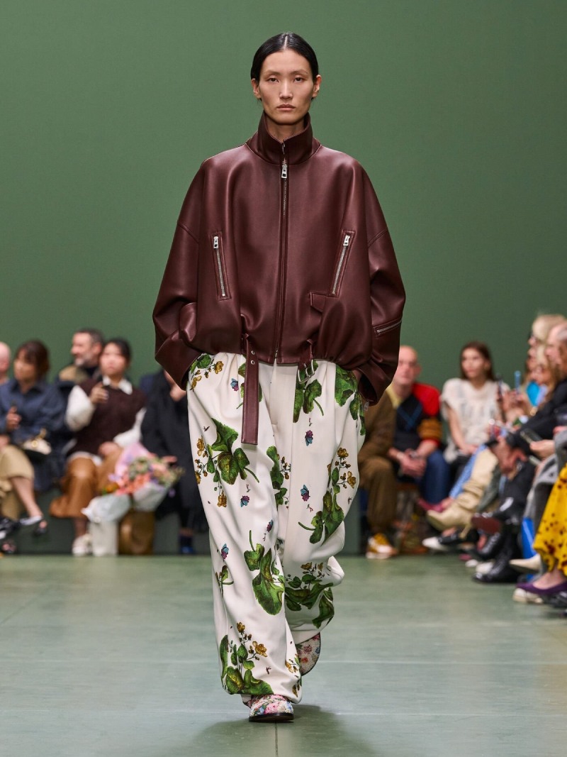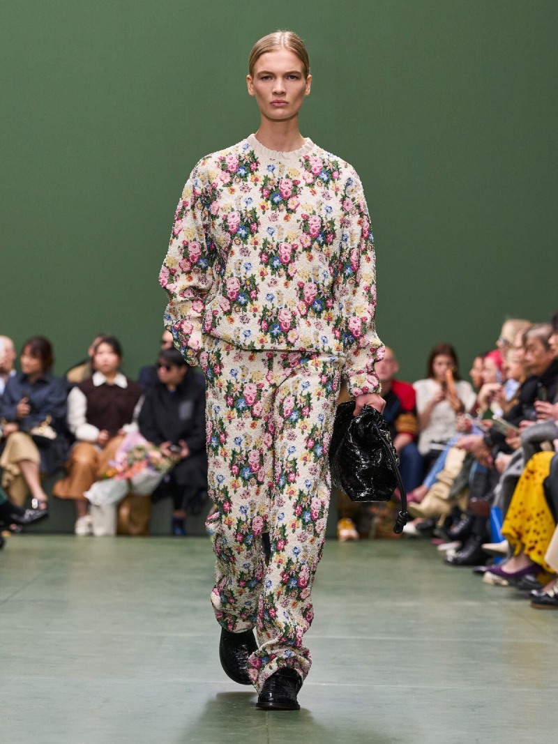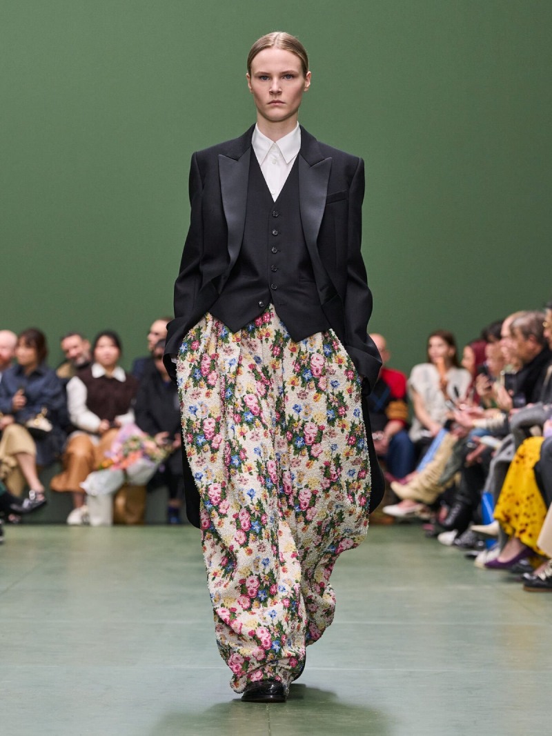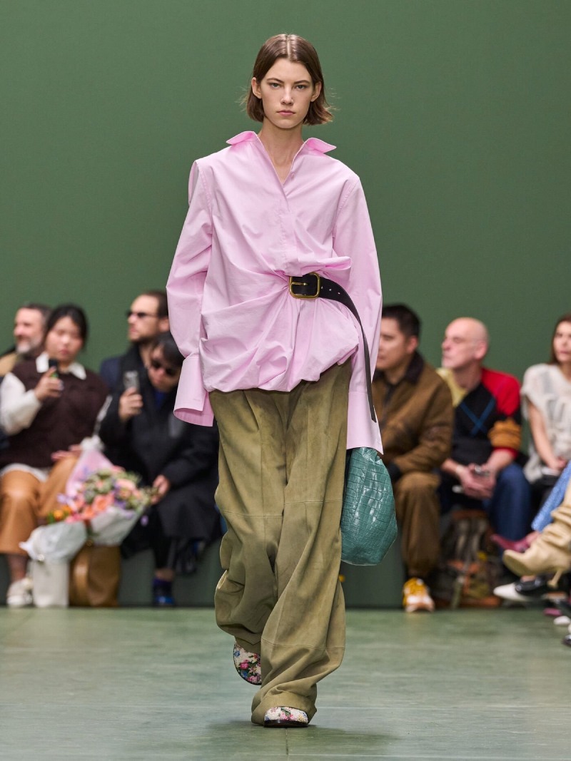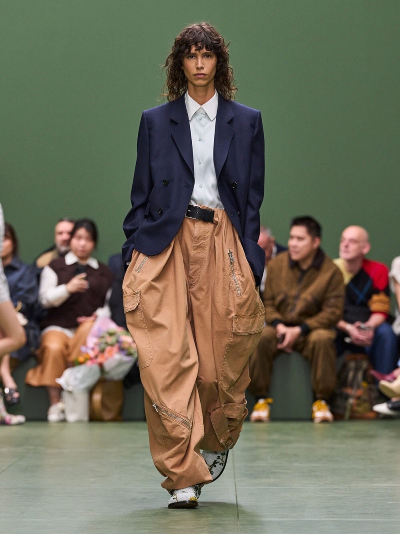 Seguidamente, Loewe Mujer FW24 introduce un vestido de construcción voluminosa decorado por el motif de un carlino, y versiones subsecuentes en colores lisos para apostar por el minimalismo clásico. Entre medias, vemos conjuntos de seda decorados con flores, tartán y trampantojo de avestruz, vestidos de cuero y más recursos florales clásicos. Los pantalones cargo de corte ultra baggy y las camisas oxford de corte oversize vuelven a convertirse en staples del armario femenino.